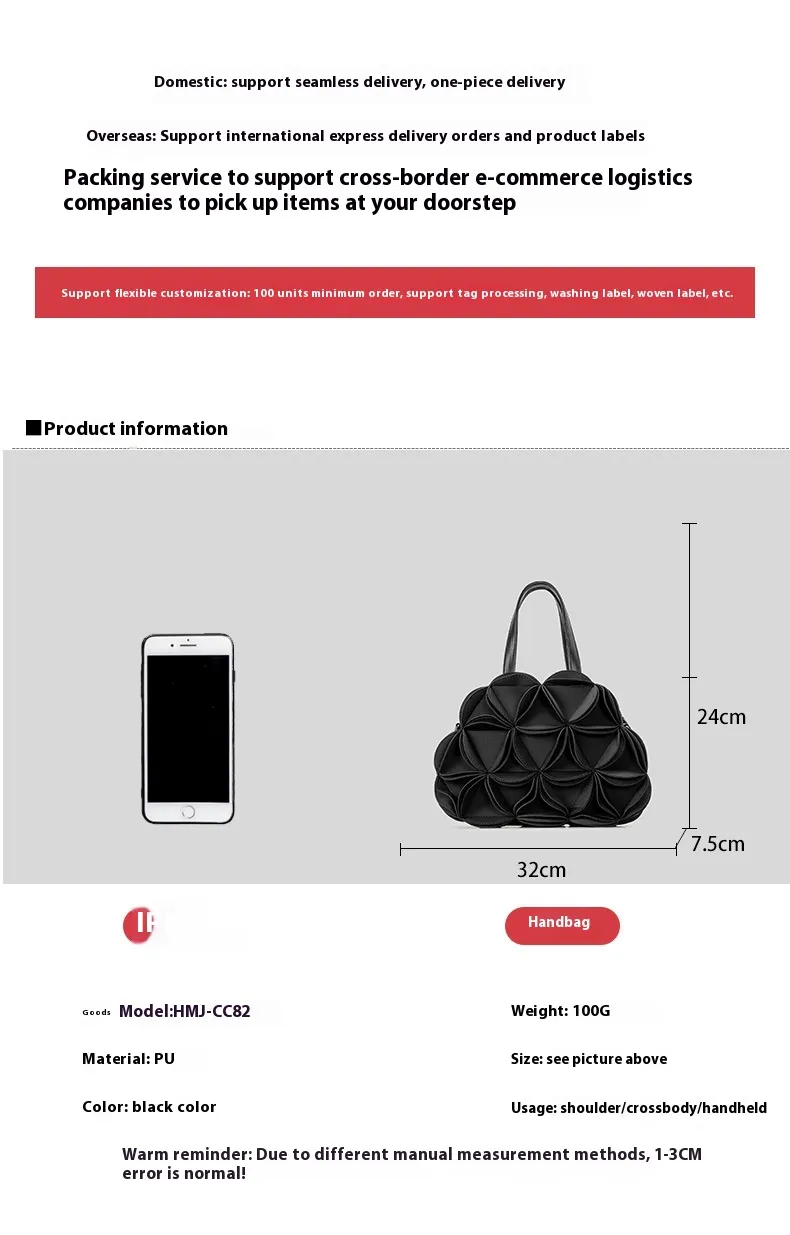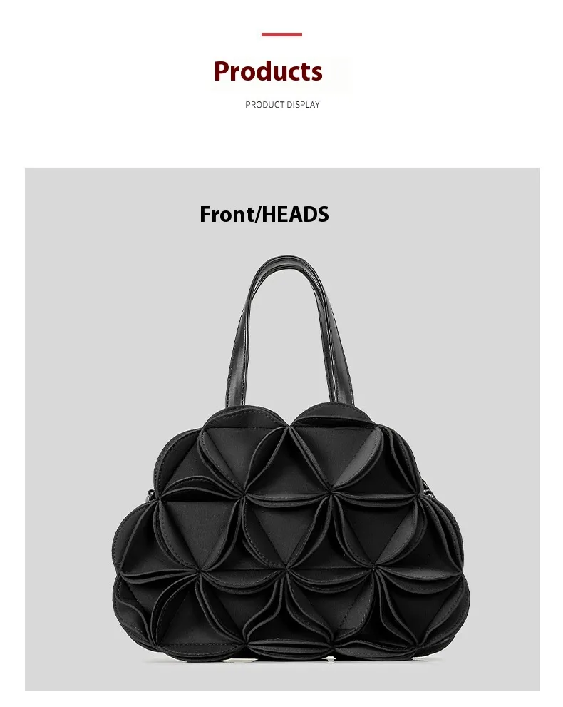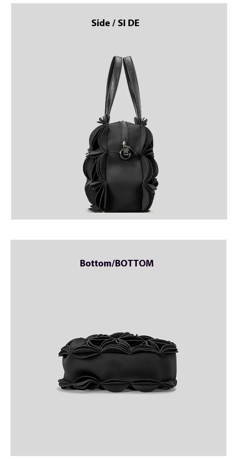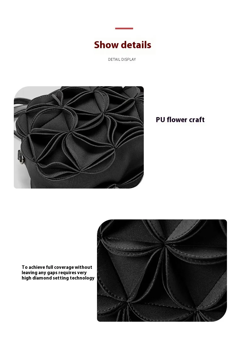 The flower-shaped design of this bag sets it apart from traditional handbags. The intricate PU stitching gives the bag a refined and artistic look, creating an eye-catching accessory that complements a variety of outfits. Its unique shape adds a touch of whimsy and charm, making it the perfect addition to any wardrobe.