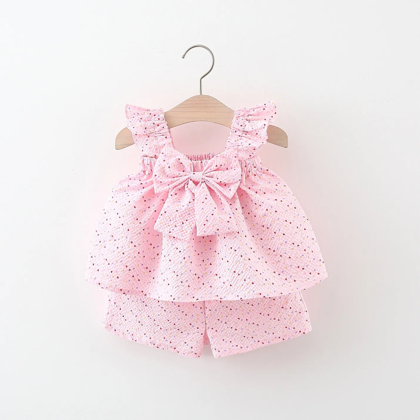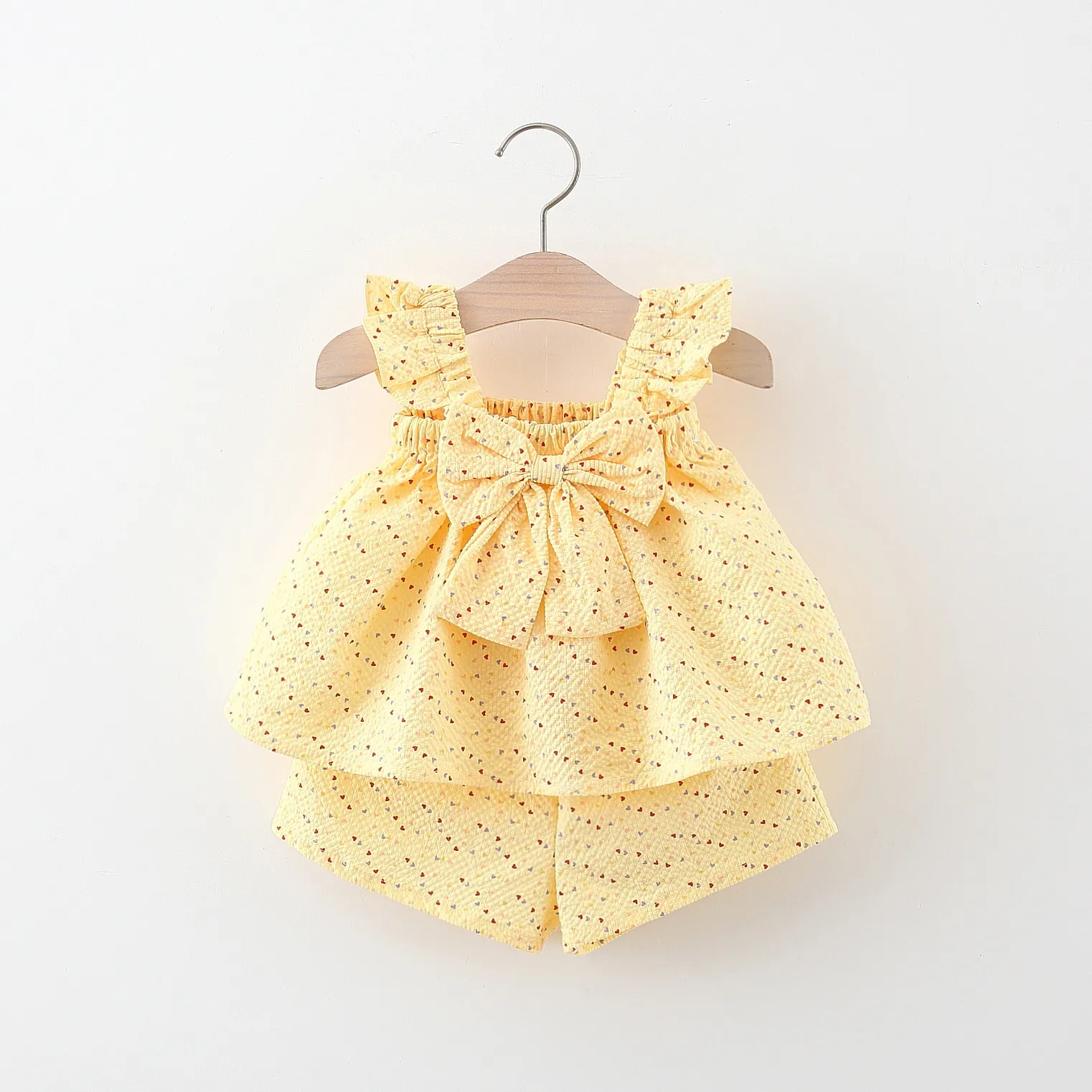 The Flying Sleeve Length Bowknot Dress Shorts Two-piece Set is a stylish and charming outfit perfect for young girls who love to combine comfort with elegance. Featuring flowing flying sleeves and a delicate bowknot detail, this two-piece set includes a dress-style top paired with matching shorts, offering a versatile and fashionable look. Ideal for casual outings, parties, or family gatherings, this set provides both comfort and a trendy appearance that your child will adore.
