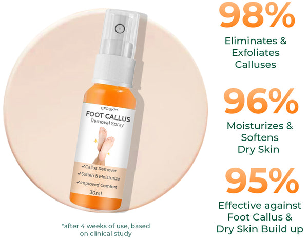 GFOUKâ„¢ Foot Callus Removal Spray normally works by softening and breaking down the thicker, hardened skin of calluses. The spray composition enables simple and focused application. The active components in the spray are intended to penetrate the thickened skin and reach the callus layers.
