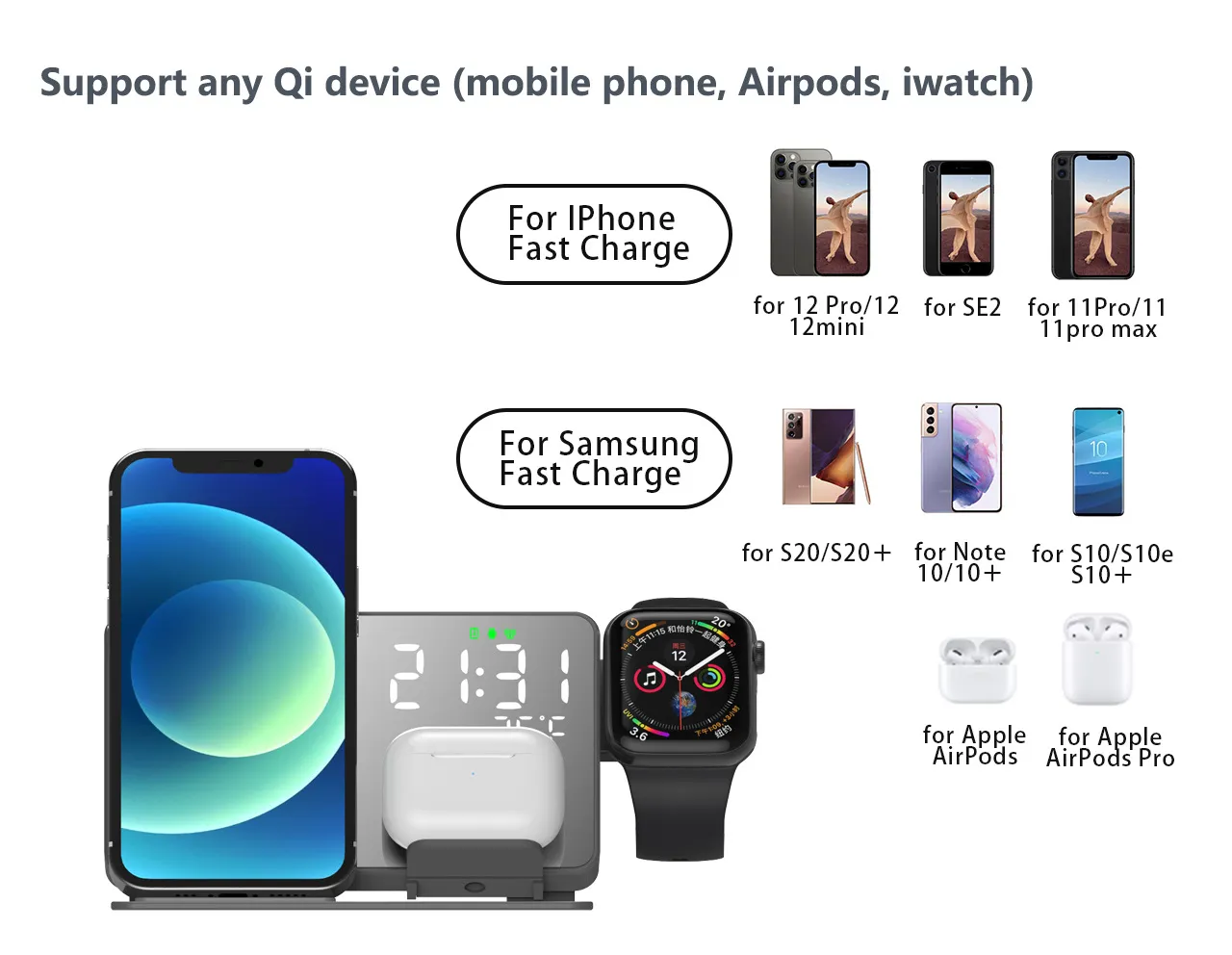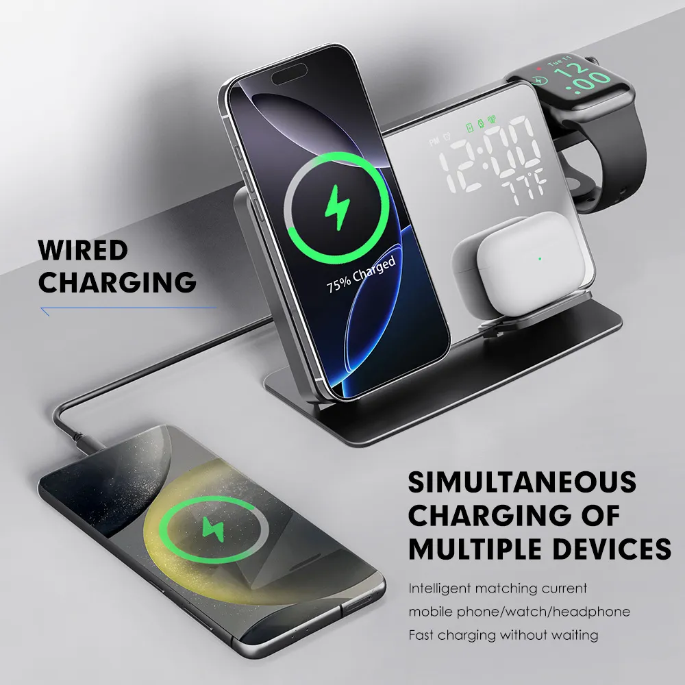 Equipped with advanced wireless charging technology, this four-in-one charger delivers stable and fast charging to compatible devices. Its smart power allocation ensures your devices are charged efficiently without overheating, overcharging, or short-circuiting.