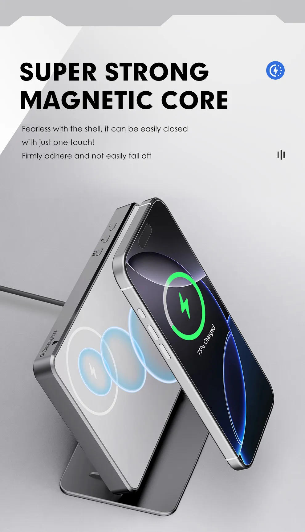 Crafted with premium materials, the charger features a modern and compact design that complements any workspace or home environment. Its non-slip base keeps devices stable, while the durable construction ensures long-lasting use.
