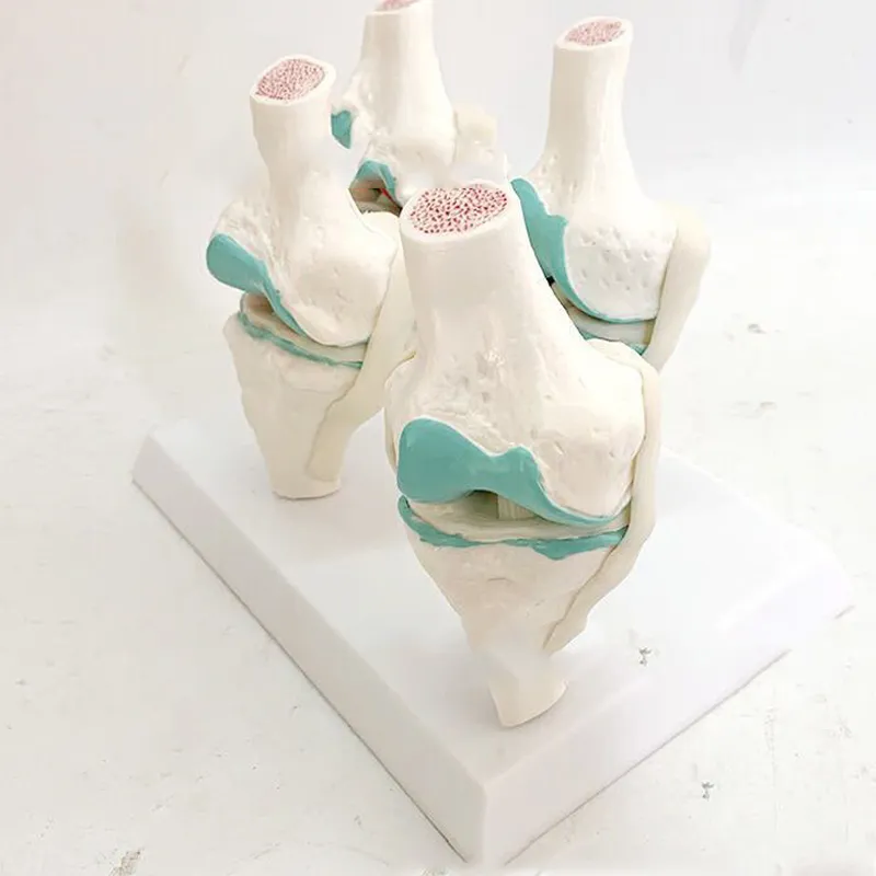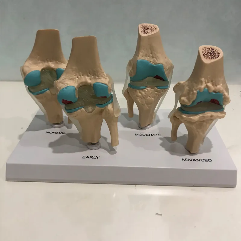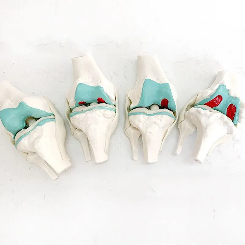 The model features four distinct stages of knee disease, starting with a healthy joint and progressing through mild, moderate, and severe degeneration. Each stage highlights specific changes, such as cartilage thinning, bone spurs, and increased inflammation. This progression helps students and professionals identify the characteristics of each stage, supporting learning about diagnosis, treatment, and patient care strategies.