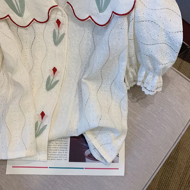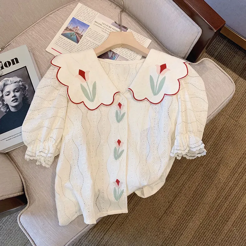 Key Features of the French Style Doll Collar Embroidered Printed Short Sleeve Shirt