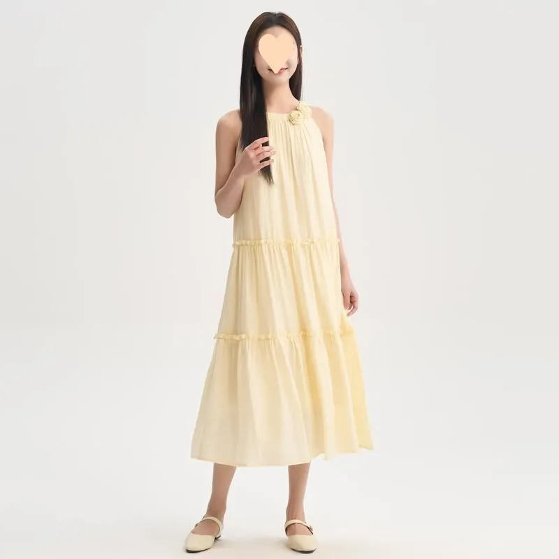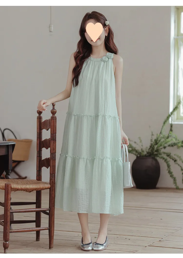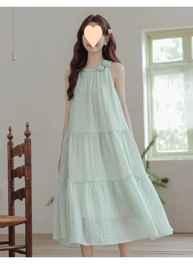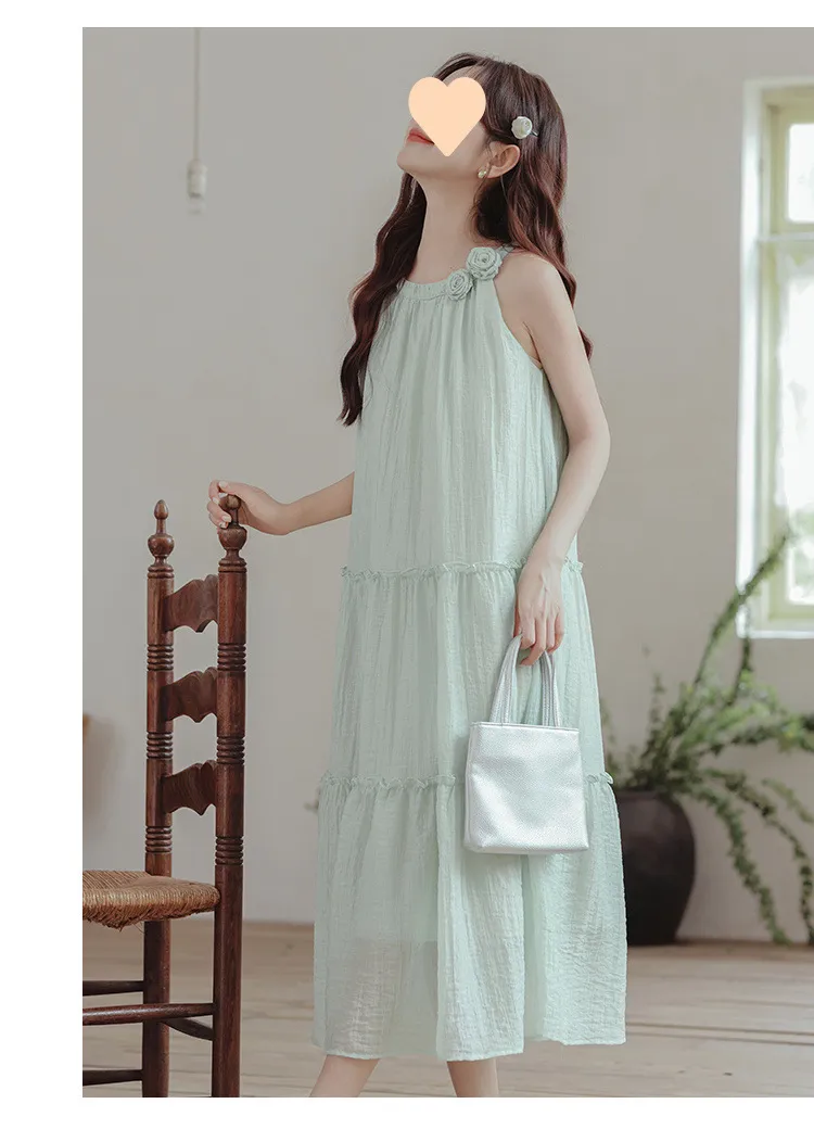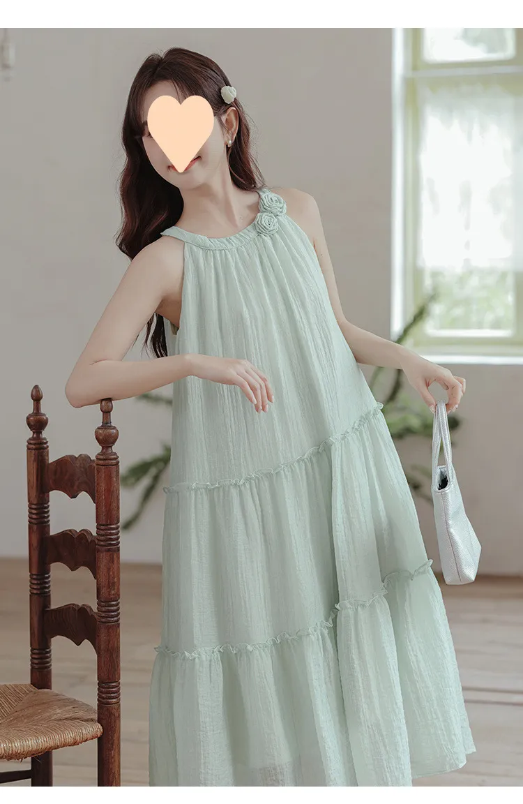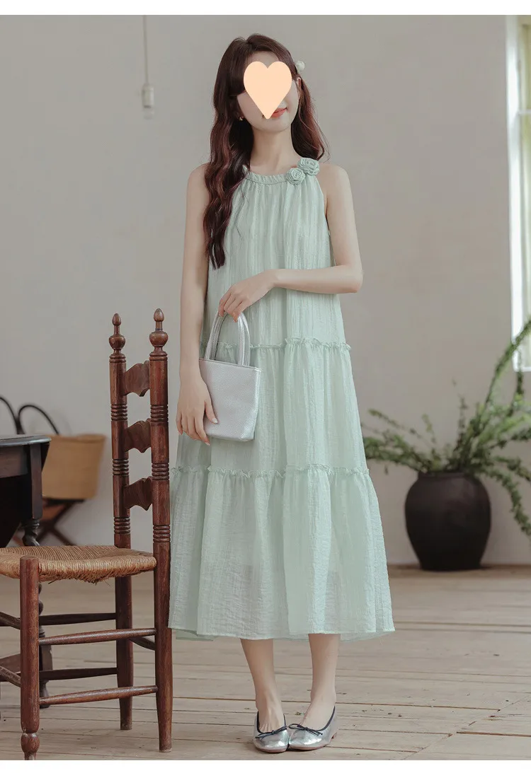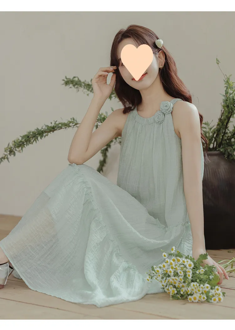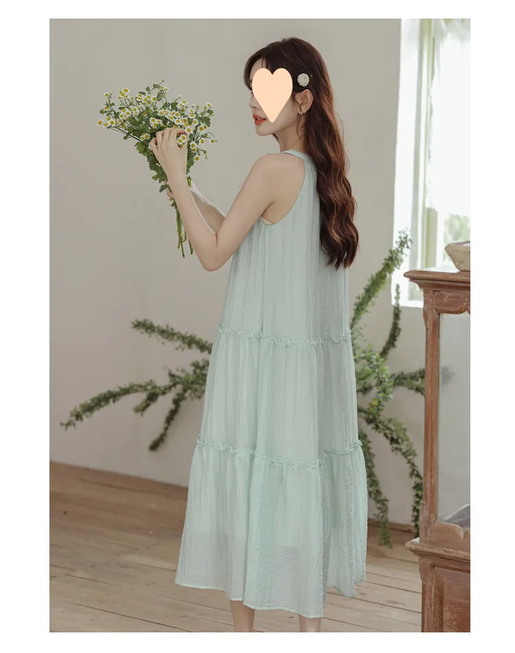 The delicate spaghetti straps and sleeveless cut provide a flattering, feminine look, while the long length adds a touch of elegance suitable for beach outings, garden parties, or casual summer events. Inspired by classic French fashion, the dress embodies understated sophistication with its clean lines and airy feel.