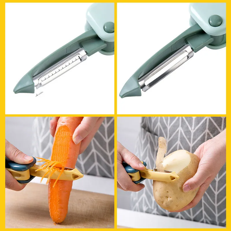 This kitchen tool combines the benefits of three essential cooking tools into one compact design. It functions as a fruit peeler, paring knife, and vegetable grater scraper, allowing you to effortlessly peel, slice, and grate with ease. No more switching between multiple devices—this two-in-one tool has got you covered for a variety of food prep tasks.
