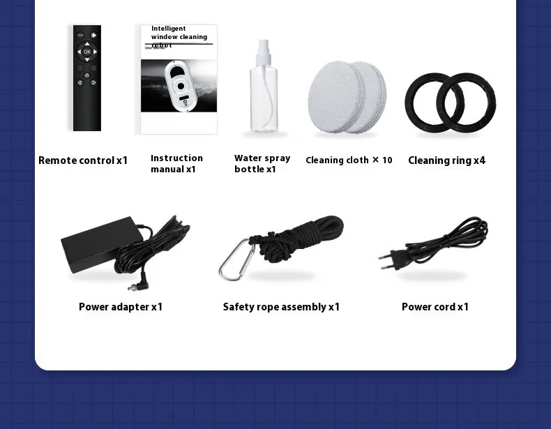 Cleaning Machine*1,Remote control * 1, instruction manual * 1, spray bottle * 1, cleaning cloth * 10, cleaning ring * 4, power adapter * 1, safety rope adapter * 1, power cord * 1