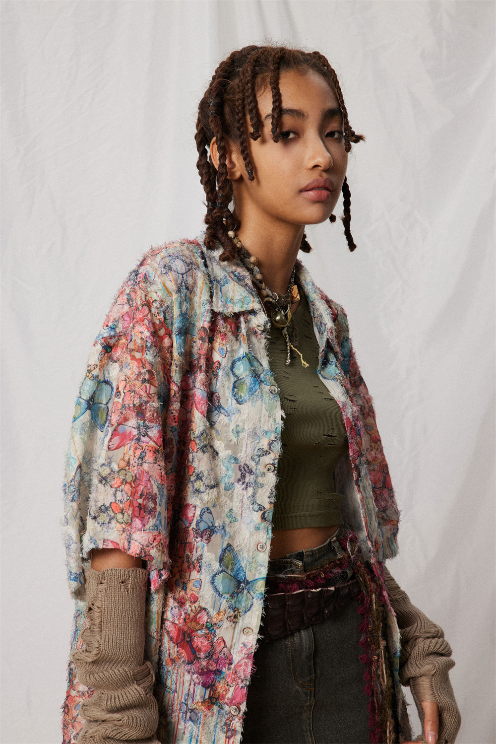 nights. This shirt features a bold, all-over print that captures the essence of summer with its bright colors and dynamic patterns. Made