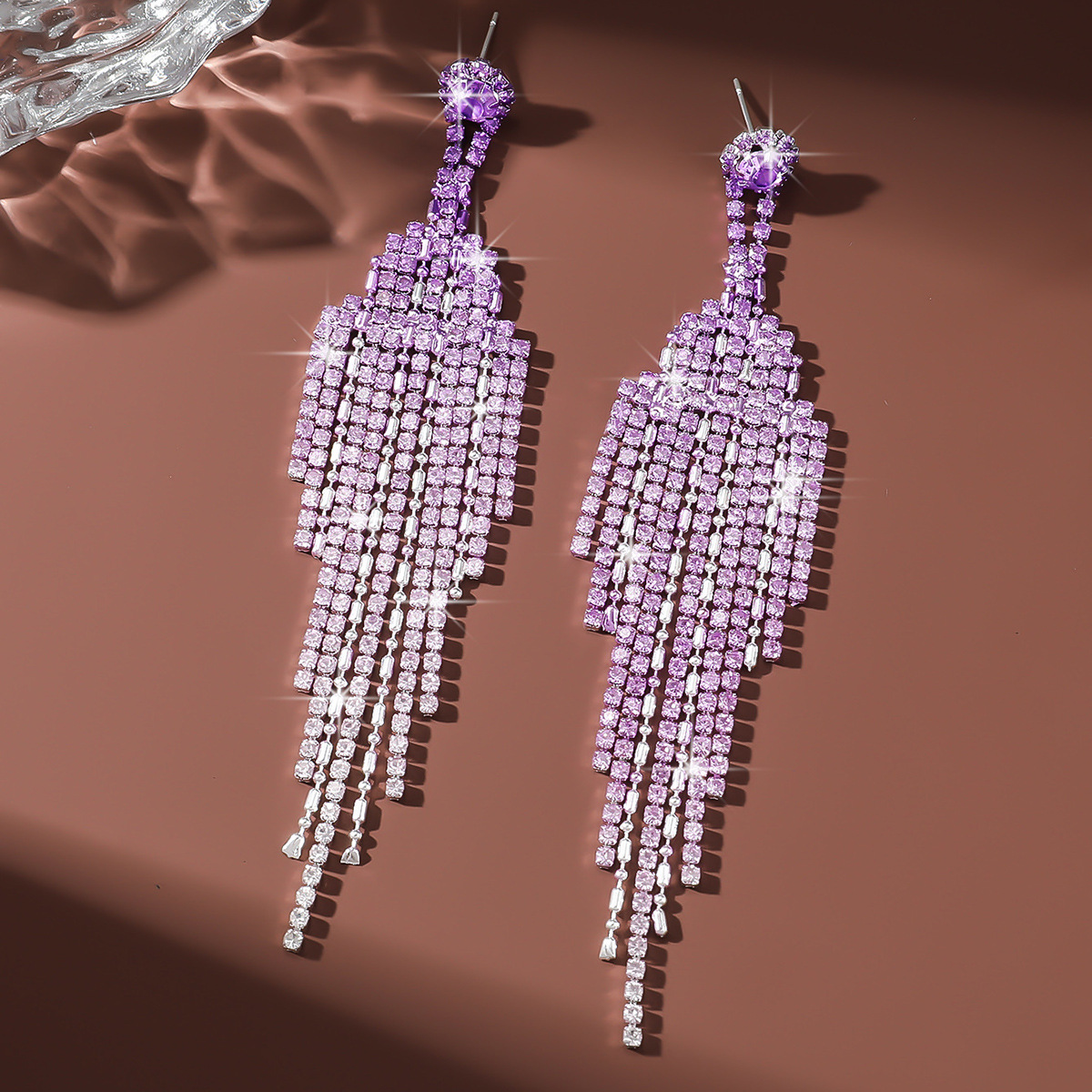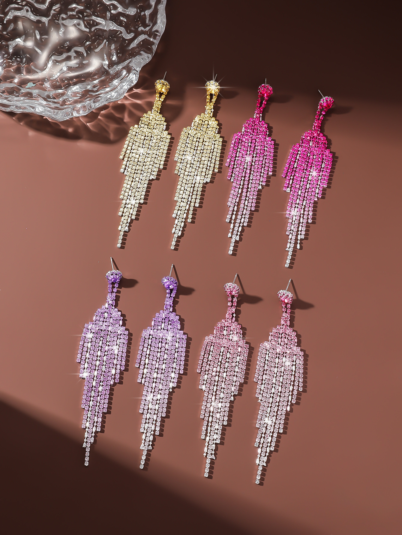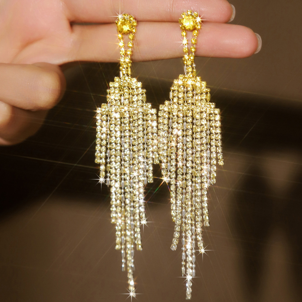 tassel design. The rhinestones are meticulously set to catch the light from every angle, creating a dazzling effect that enhances any