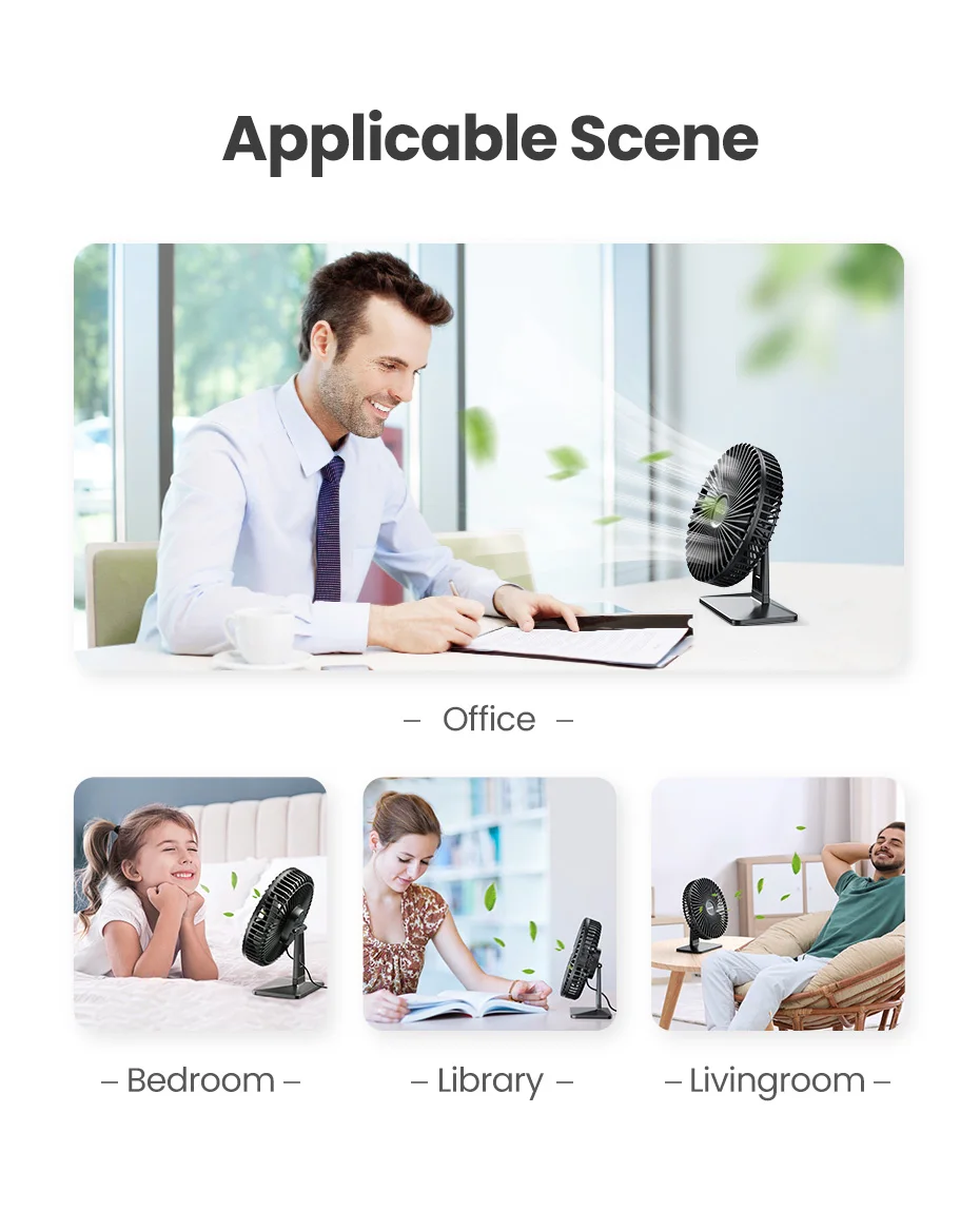 Desk fans have good noise handling capabilities. Although the wind speed of the desk fan is high, it is very quiet, and the noise is less than 50dB even in the case of strong wind. It's a quiet friend for work and sleep, perfect for your desk, office bedroom.