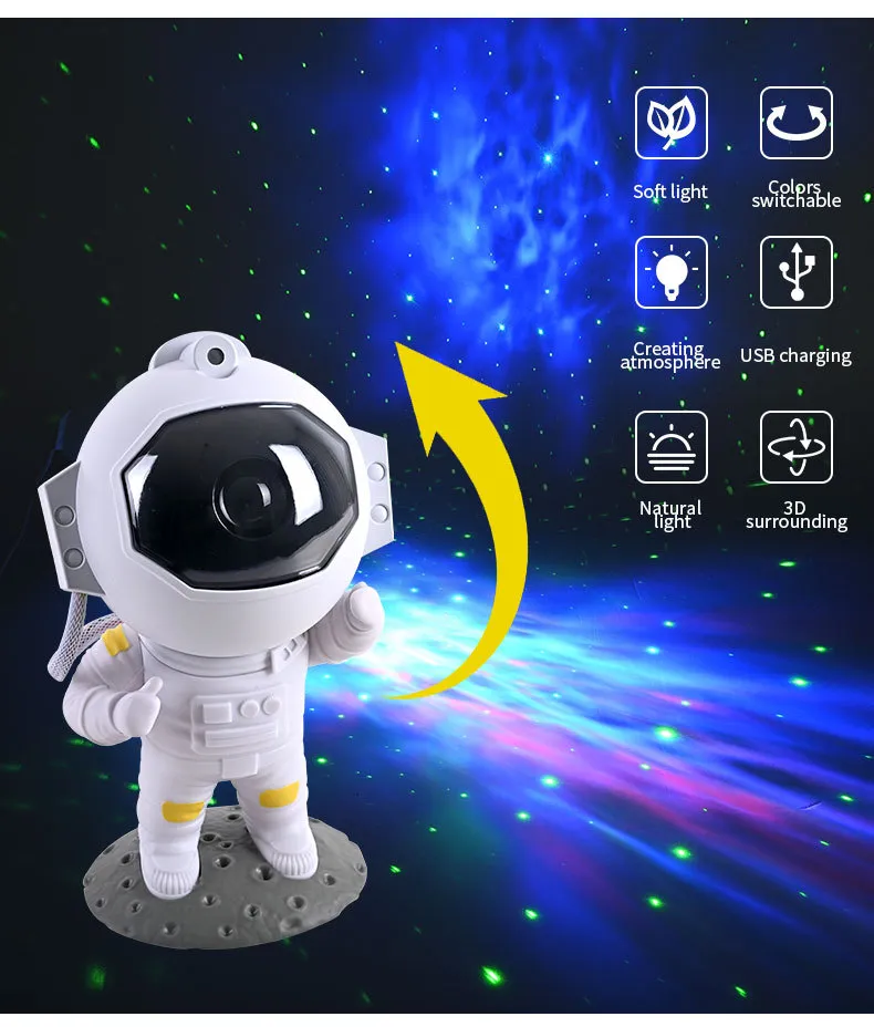 Perfect for bedroom decor, home lighting, or as a gift for astronomy enthusiasts, this galaxy projector is designed to project a realistic starry night sky across your walls and ceiling. With its charming astronaut design and vibrant light projections, it is not only functional but also adds a playful, futuristic touch to any room.