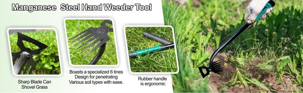 - 【Dual Purpose Weed Puller Gardening Tools】Our 6 teethes garden weeding tool is suitable for weeding, digging, and shoveling. The sharp teethes can remove weeds for cramped spaces, a hassle-free solution to weed removal.