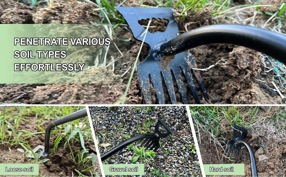 - 【Durable Material】The four-tooth weeder is made of high-quality manganese steel, sharp and wear-resistant, with high hardness, and the polished surface is non-stick. It also has high impact resistance and tensile strength. Precision forging makes it strong and durable