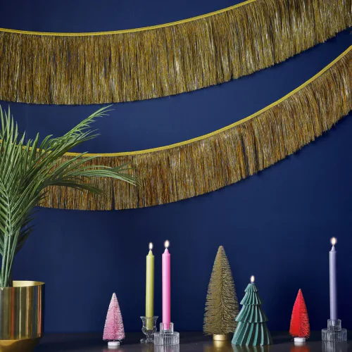 Add some festive glitz to the room with this gold tinsel garland.Bring your party to life with our multicoloured fringe tinsel garland. A great festive decoration to add to any Christmas party, it's sure to shimmer and shine as your guests party the night away!