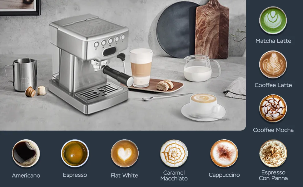 - 【20 BAR PROFESSIONAL PUMP】20 bar high pressure extraction out of the quality coffee liquid filled with golden crema, making the espresso more aromatic and richer.Stainless steel boiler system makes espresso more fragrant and rich in crema.