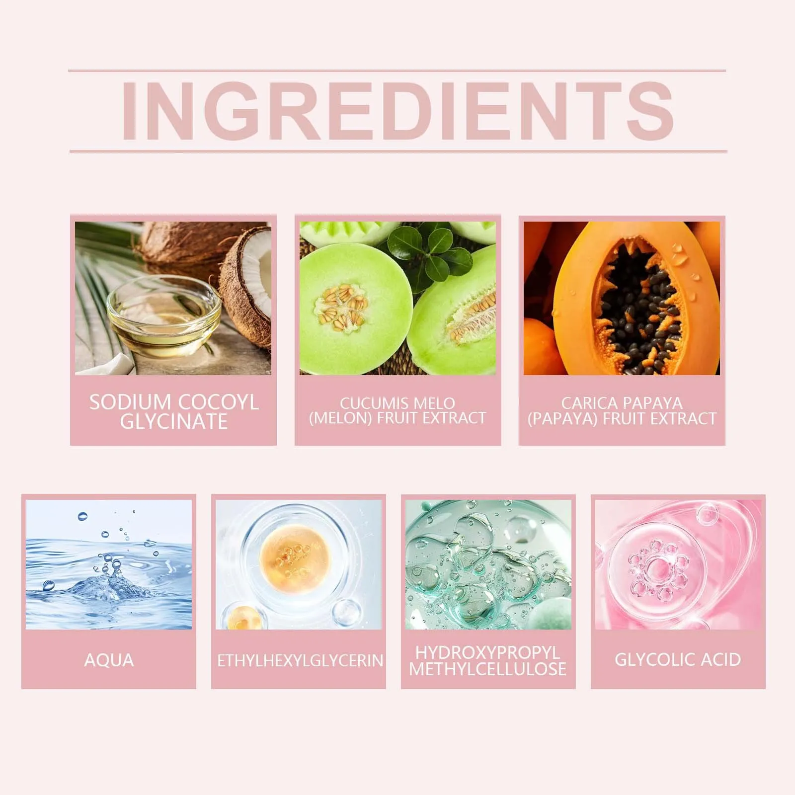 Ingredients: Water, Sodium Cocoyl glycinate, hydroxypropyl methyl cellulose, ethyl hexyl glycerol, melon fruit extract, papaya fruit