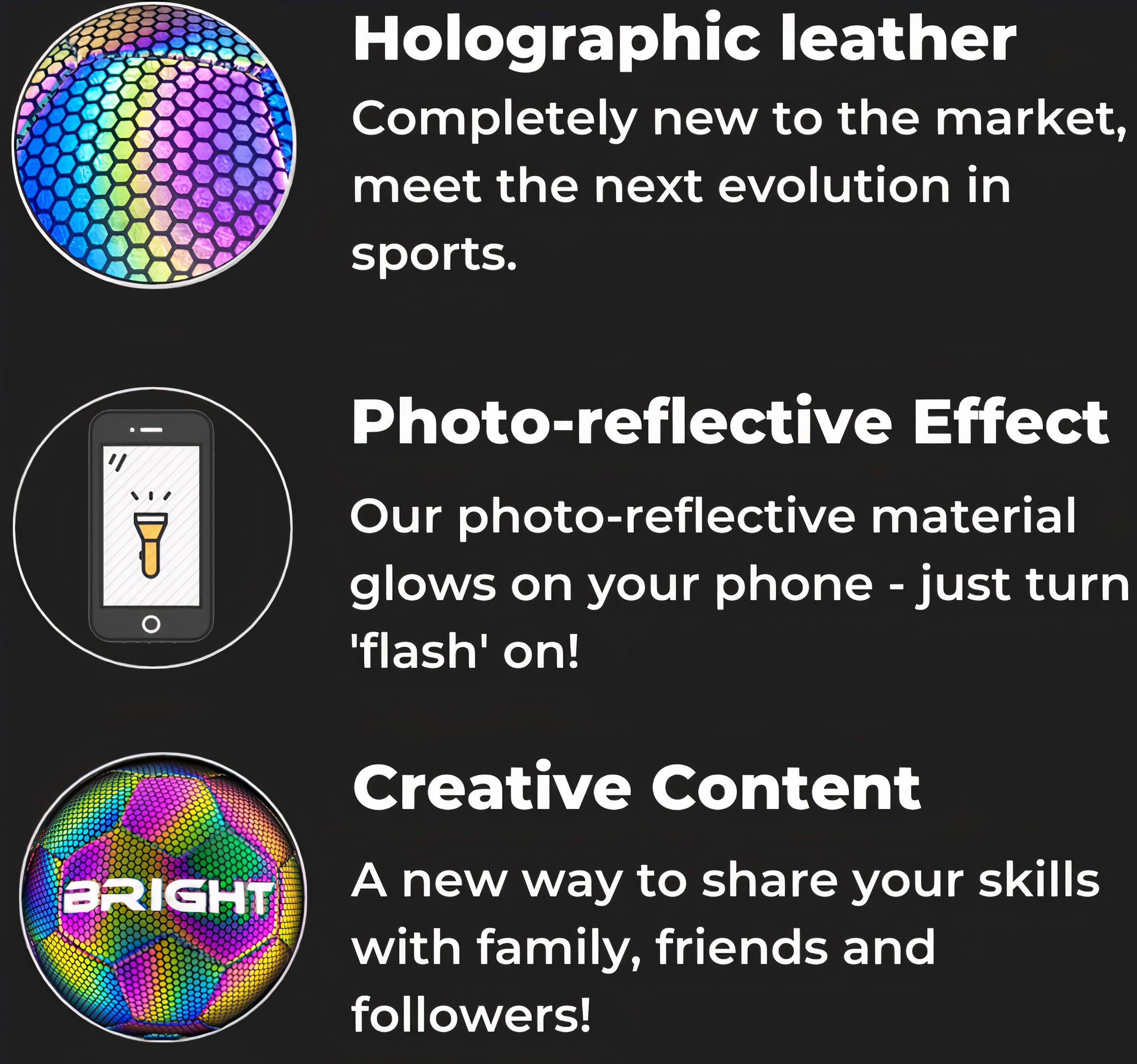 The BRIGHT™ Football is made of high quality reflective leather with a holographic effect and has the feel and resilience of a normal football. The ball appears black when it is completely dark and no light is shone on it, but when you take a photo/video with a flash, the ball lights up on your phone screen.