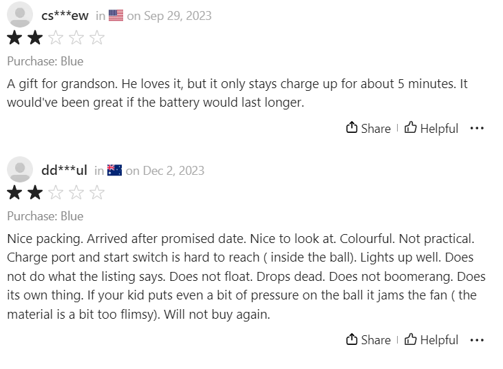 When you pay peanuts, you get monkeys. Expecting a high-quality levitating device that changes colours and does boomerang effects for a lower amount is unrealistic, even if advertised as a 'Flying Ball'. Opting for a cheaper alternative means you'll likely receive a vastly different product from what you expect. Such as a plastic model lacking the ability to levitate or change colours and requiring batteries.