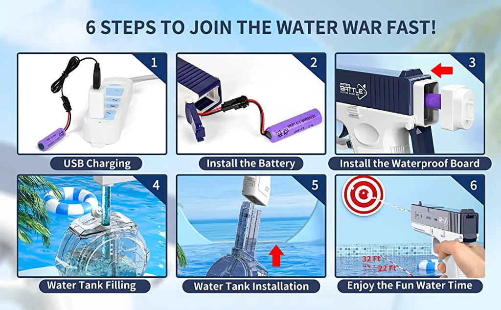 Our water pistol has a large capacity, holding up to 330ml of water and working powerfully with a 7.4V 1500mAh battery. With a shooting