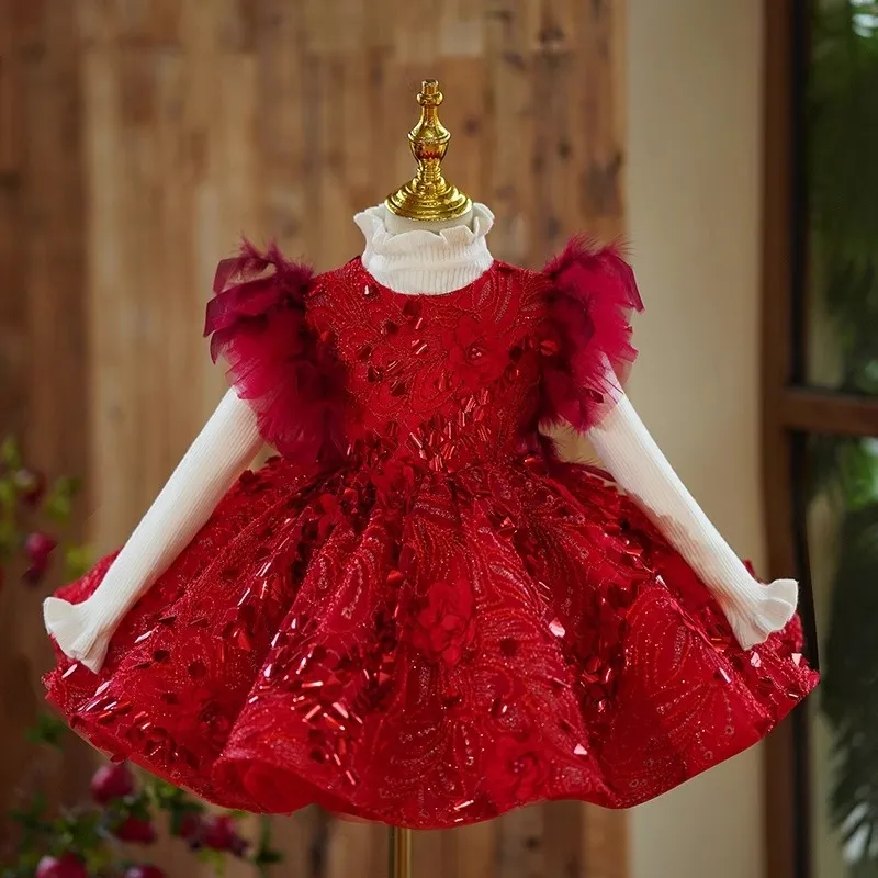 The standout feature of this dress is its rich red color, which exudes elegance and sophistication. The vibrant red hue makes this dress perfect for occasions like birthday parties, weddings, or even holiday celebrations. The dress is adorned with princess-like detailing, including a beautifully fitted bodice, tulle skirt, and delicate embellishments that add a touch of sparkle and magic. This enchanting design ensures that your little one will feel like the center of attention at any event.