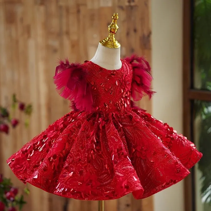 The standout feature of this dress is its rich red color, which exudes elegance and sophistication. The vibrant red hue makes this dress perfect for occasions like birthday parties, weddings, or even holiday celebrations. The dress is adorned with princess-like detailing, including a beautifully fitted bodice, tulle skirt, and delicate embellishments that add a touch of sparkle and magic. This enchanting design ensures that your little one will feel like the center of attention at any event.