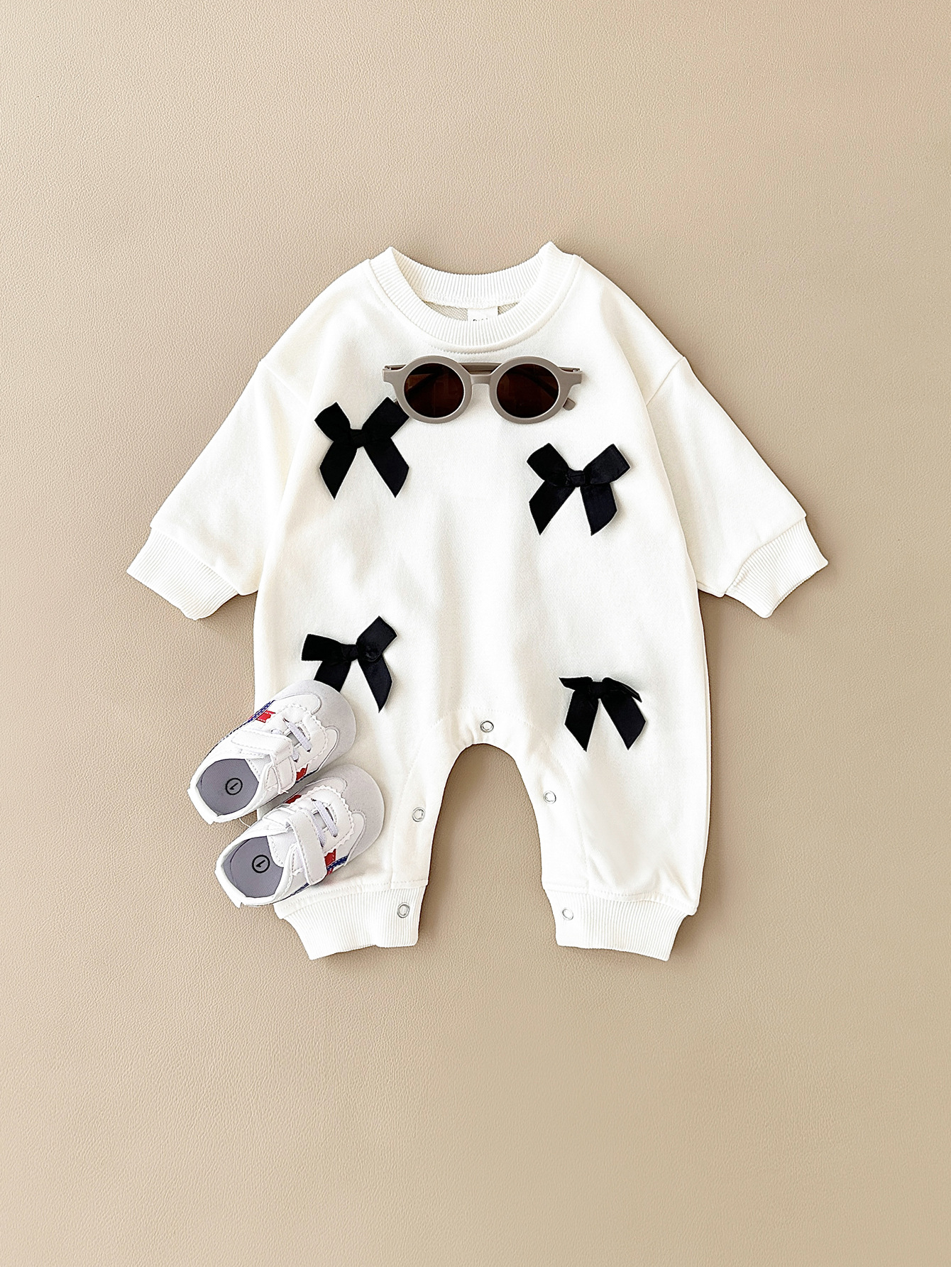 Made from soft, breathable fabric, the Girls' Fashion Personalized Bow Round Neck Jumpsuit ensures that your little one stays comfortable