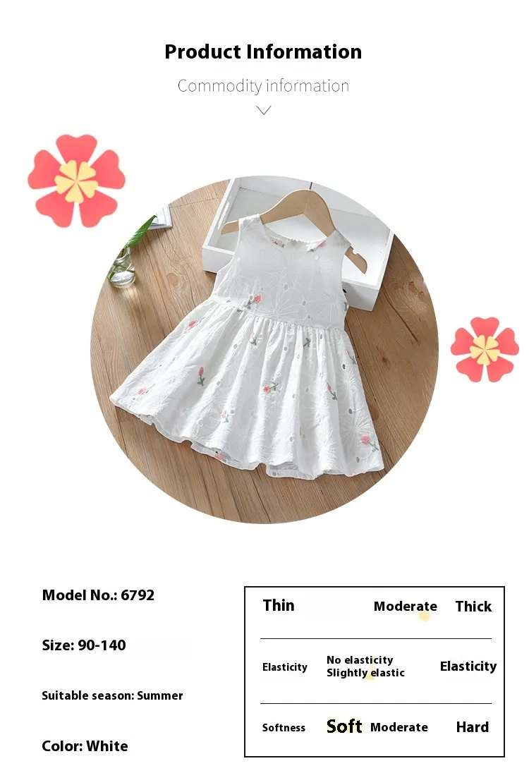 Make summer a season of comfort and style for your little one with the Girls' Summer Floral Hollow Sleeveless Vest Dress. This dress combines a beautiful floral design with a breezy, sleeveless cut, making it the perfect choice for sunny days. Whether it's for a day at the park, a family picnic, or a fun day out with friends, this dress ensures your girl stays cool, comfortable, and stylish.