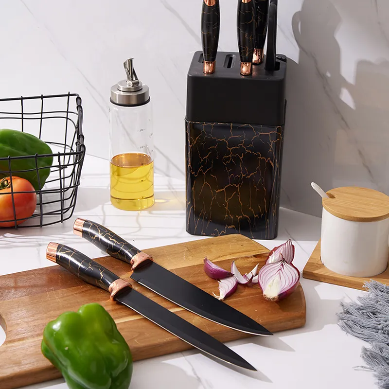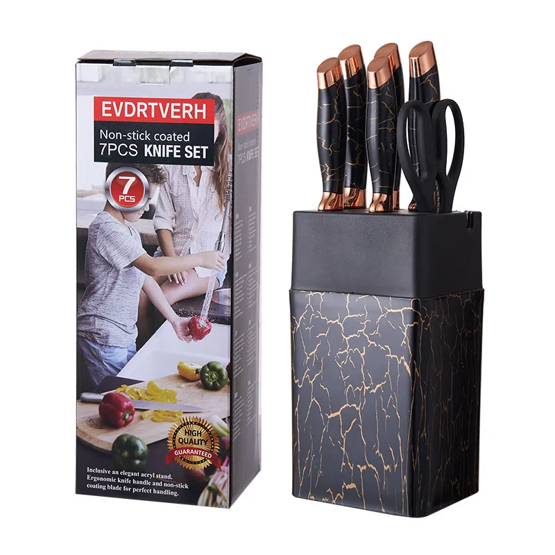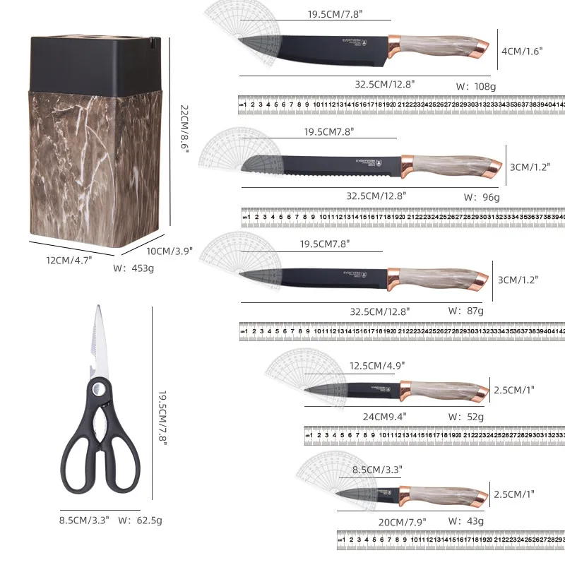7 in 1 set,including knife holder/Fruit knifeComplementary food knife/Bread knife/Cooking knife/Chef's knife/peeler.