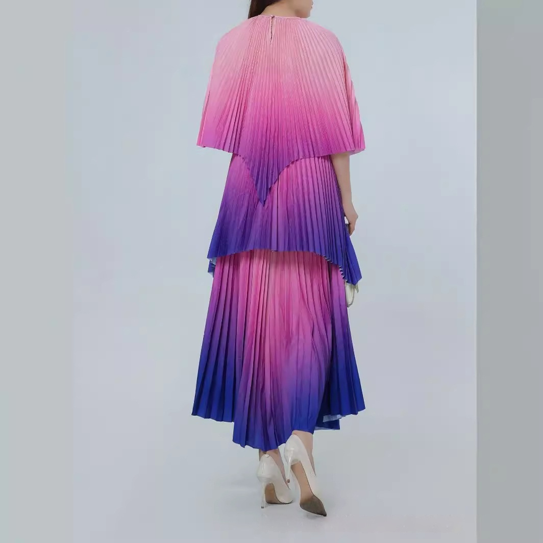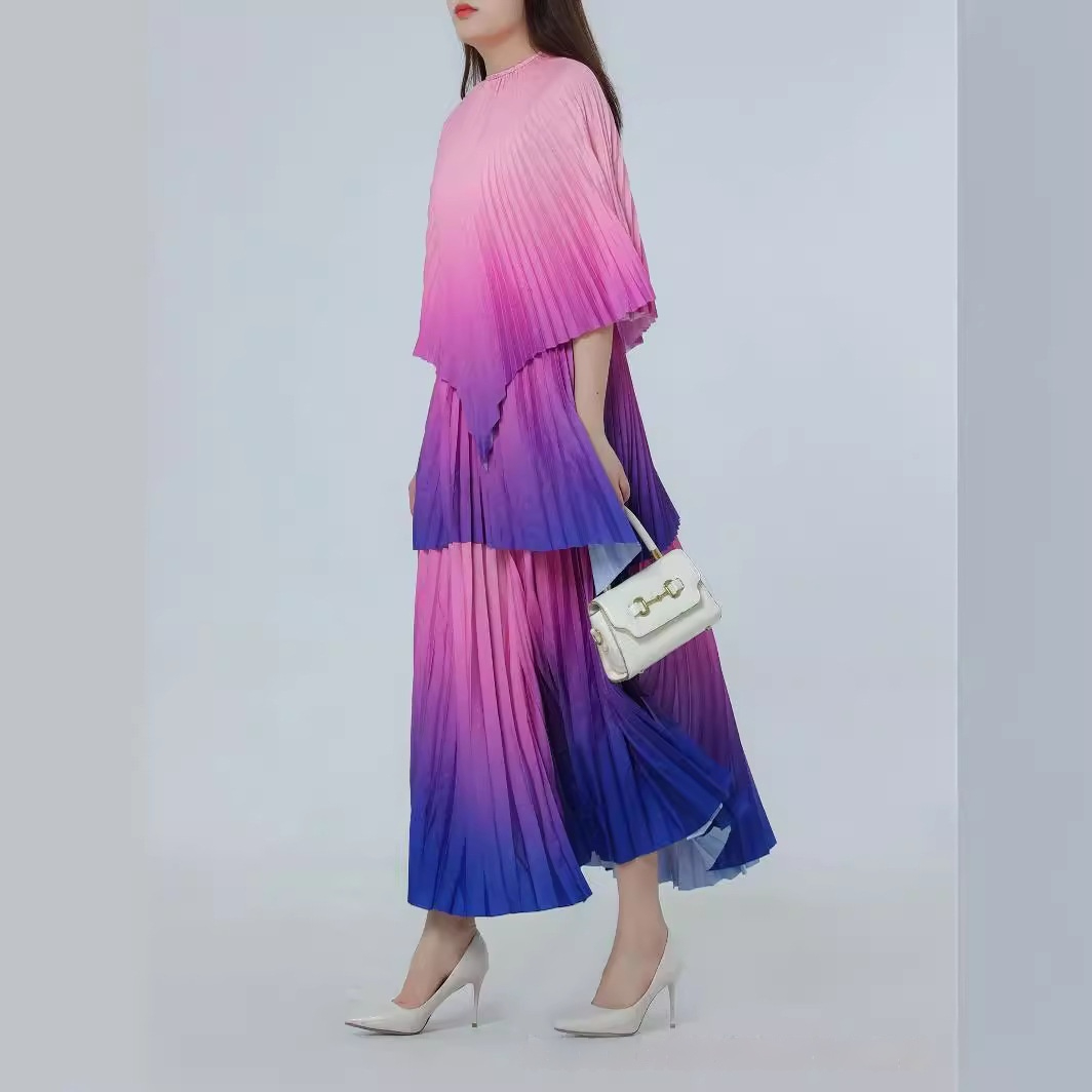 Gradient Color Temperament Printed Cape Top Pleated Loose