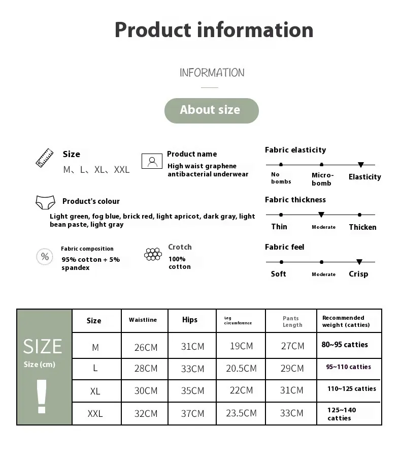 The Graphene High Waist Antibacterial Women's Underwear Printed Pure Cotton is designed with cutting-edge graphene technology, offering both comfort and functional benefits. The high-waisted cut provides full coverage, ensuring a smooth, flattering fit that works with a variety of body types. The antibacterial properties of the fabric help to keep you feeling fresh and clean throughout the day, while the printed pure cotton fabric ensures that you stay comfortable with every wear.