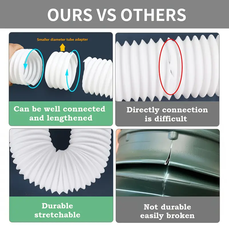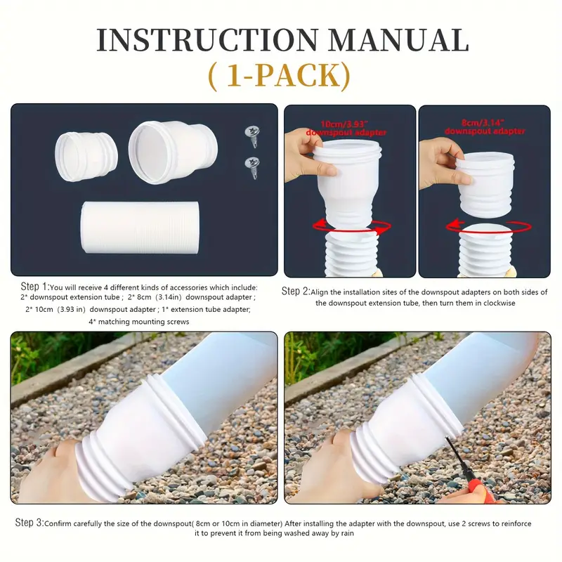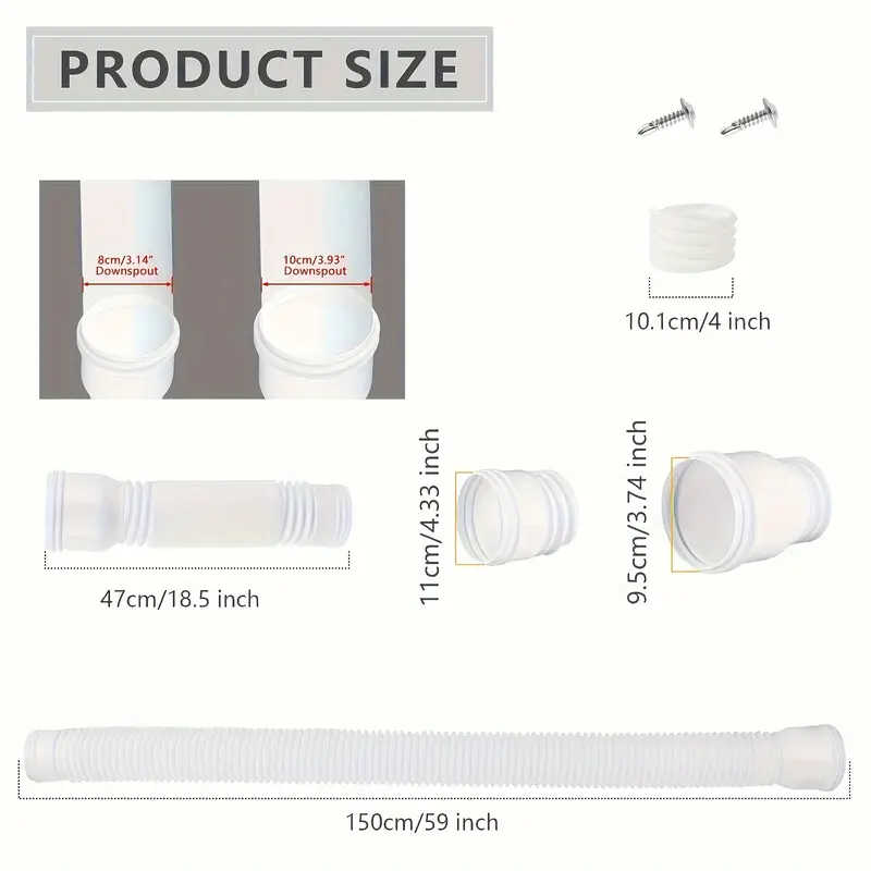 The ownspout Extension is constructed from durable plastic that is resistant to tearing and breaking, allowing for easy adjustment of the pipe's length. Our downspout extension connector can be conveniently extended from 47cm to 150cm. The rainwater drainage pipe features a split design, which is both retractable and detachable, making it flexible enough to navigate around obstacles while maintaining its shape.The downspout drain extender is compatible with various pipes and standard drain tiles, helping to maintain cleaner yards and gardens while protecting your foundation from damage. Installation is straightforward: first, extend the rain gutter attachment to the desired length; then, twist both ends onto the connecting pipe; next, attach the under gutter nozzle adapter to the drain pipe; and finally, fasten it to the drain pipe using screws.Dimensions Guide: length: 47cm-150cm/18.50inch-59.06inch Contents of the Package: 1 Downspout Extension 2 Tube Heads 2 Screws