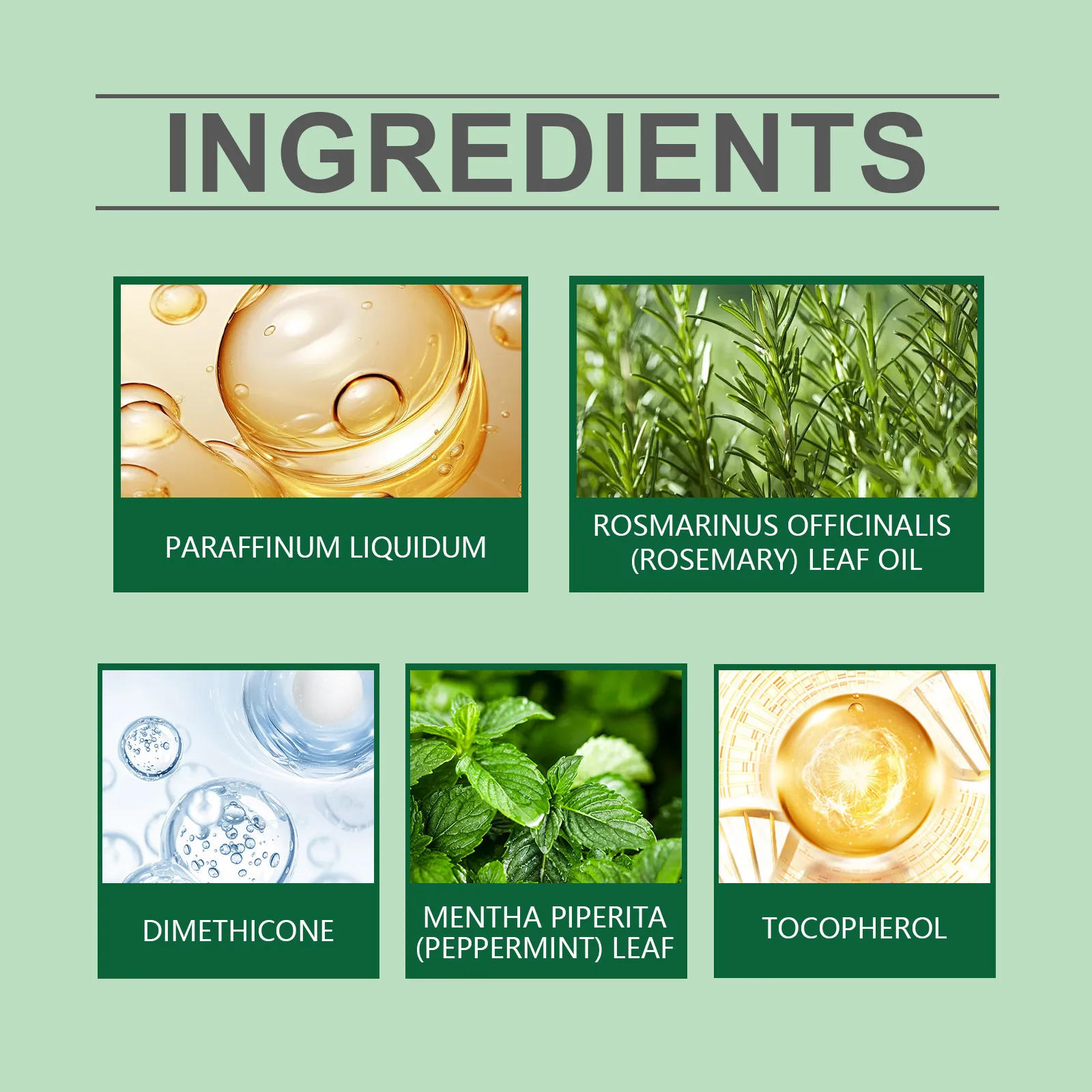 Ingredients: liquid paraffin, polydimethylsiloxane, Rosemary extract, mint leaf, vitamin E (tocopherol)
