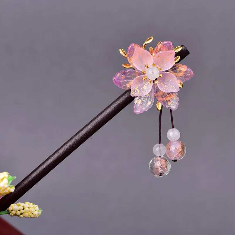 Material: colored glaze, synthetic flower, pink crystal, alloy, wooden pole