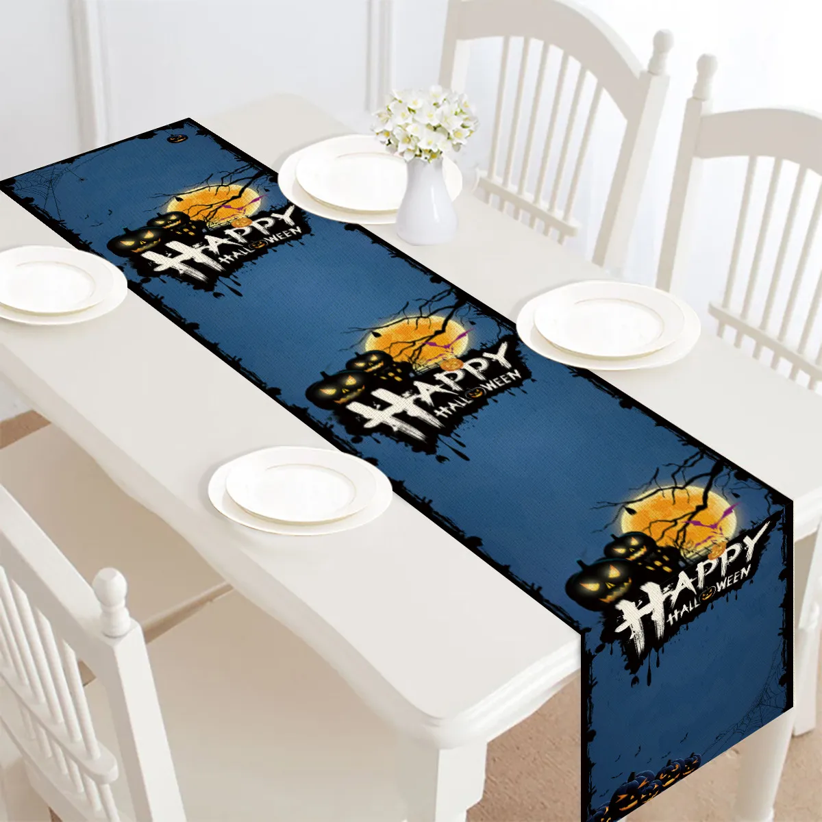 Crafted from high-quality polyester or cotton-blend fabric, the runner is soft to the touch, durable, and resistant to stains—ensuring it holds up throughout the spooky season. Its versatile design complements a variety of table shapes, from long dining tables to coffee or console tables. The runner is also perfect for layering with centerpieces, such as candelabras, jack-o'-lanterns, or decorative pumpkins, for a truly enchanting look.