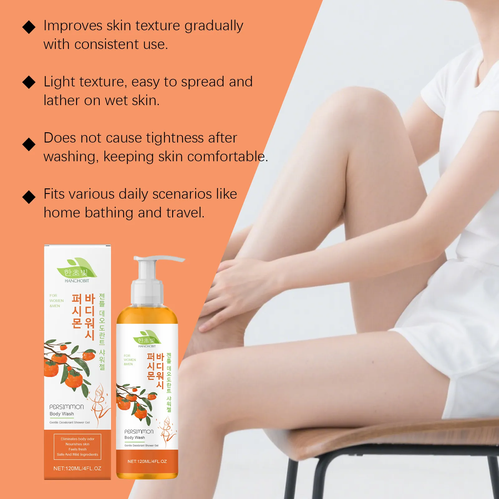 nourishing shower gel, persimmon body wash, hydrating shower gel, gentle body cleanser, daily body wash, sensitive skin shower gel, refreshing fragrance body wash, Hanchobit body care