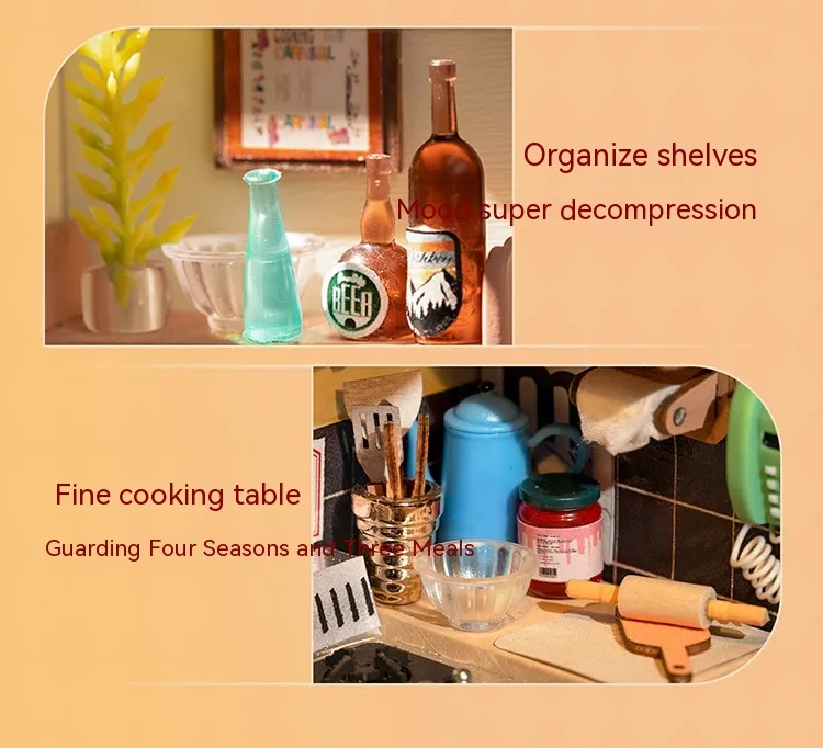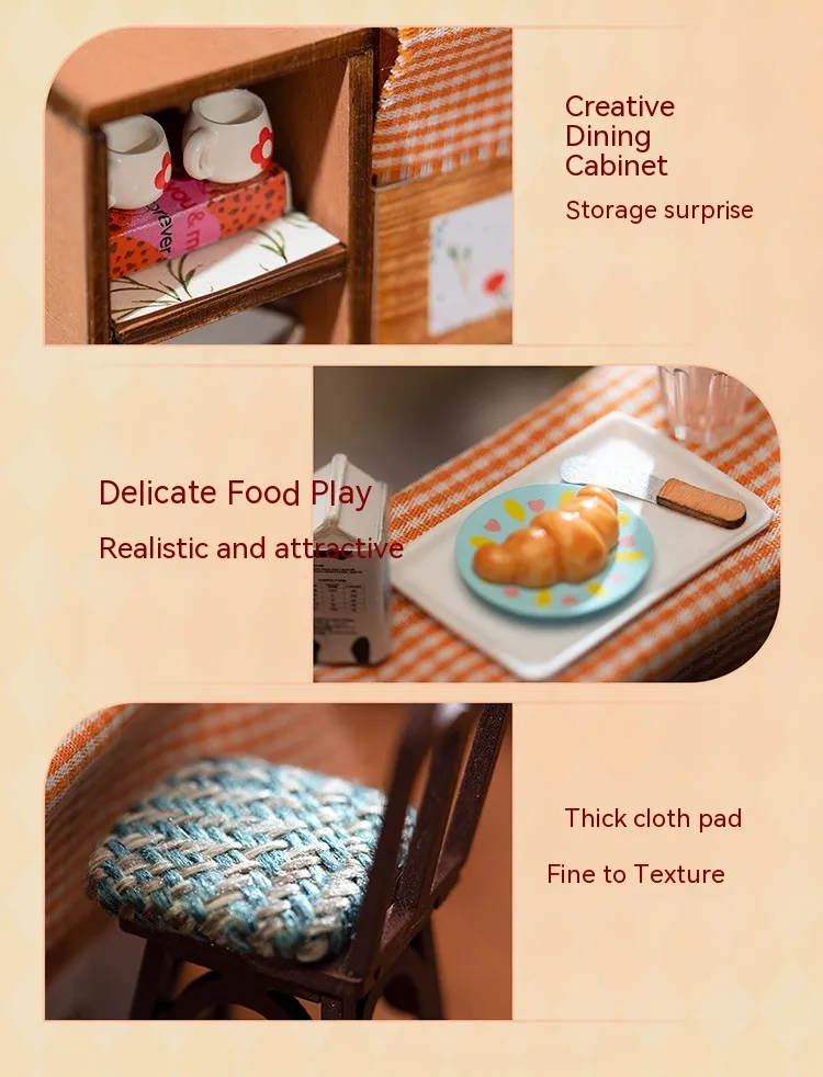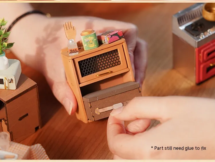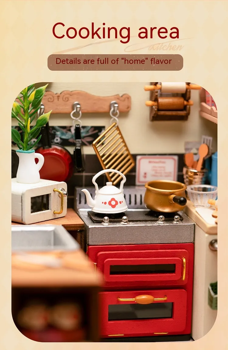 - Miniature Appliances: Includes a stove, oven, sink, and refrigerator.