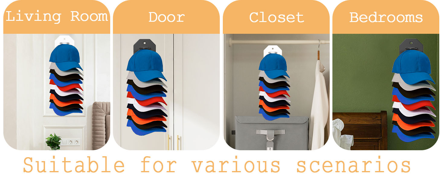 CLOSET SPACE SAVER:This compact baseball cap hat rack features a unique hanging method that saves your home space, keeps your home tidy while displaying the variety of baseball caps you own, so you can easily choose the hat you need according to what you’re wearing. Perfect for storing and decorating your entryway, hallway, living room, bedroom, cloakroom and wardrobe