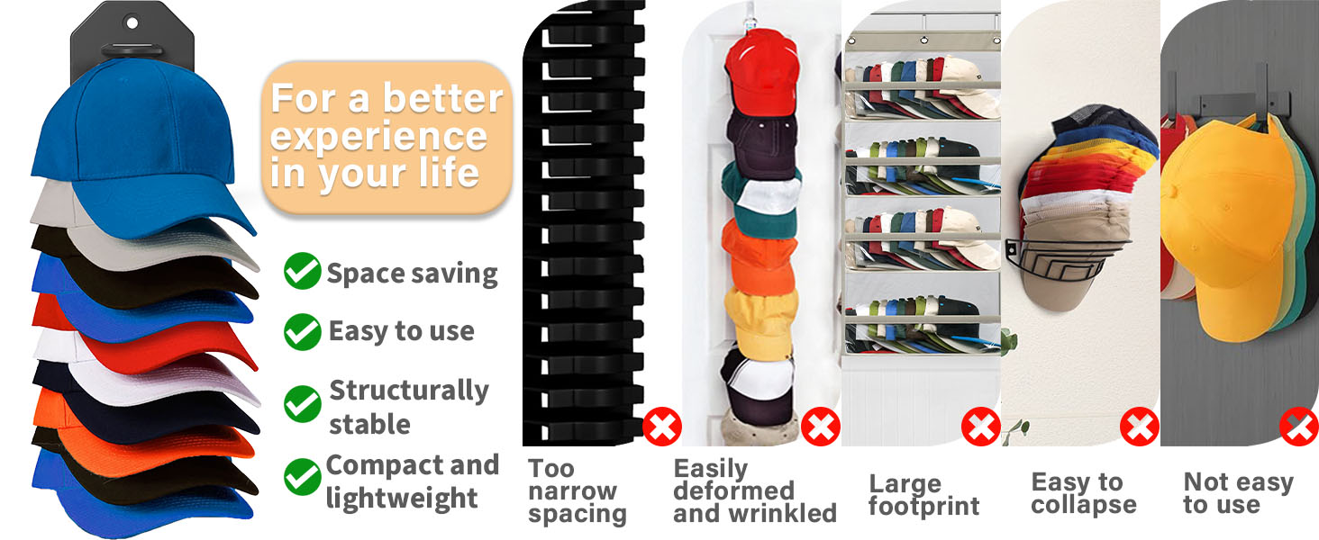 wider in width than other hat racks and have added a bracket on both sides at the same time to keep the most perfect shape while storing