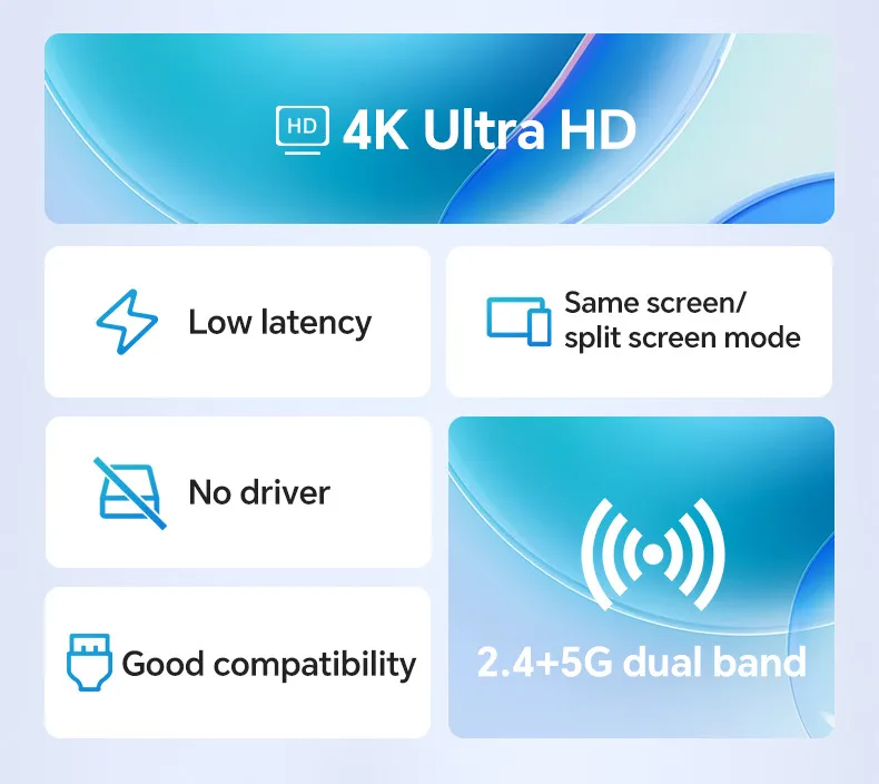 The HDMI Wireless 4K Transmitter supports 4K resolution at 60Hz, ensuring that your content is displayed with the highest quality on compatible 4K projectors, TVs, or monitors. Whether you're streaming movies, sharing presentation slides, or showcasing creative projects, you can expect ultra-clear video with vibrant colors, sharp details, and smooth motion. Enjoy a premium viewing experience with 4K clarity, making it the ideal choice for users who demand top-tier video performance.