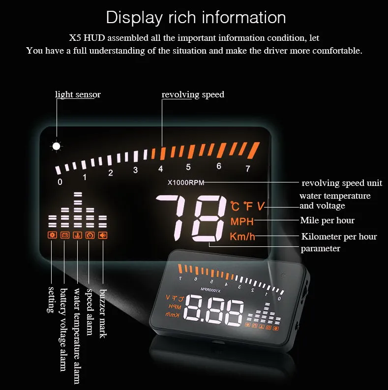 In addition to speed, the HUD projects information such as engine RPM, fuel efficiency, navigation directions, and vehicle diagnostics, making it a versatile driving companion.