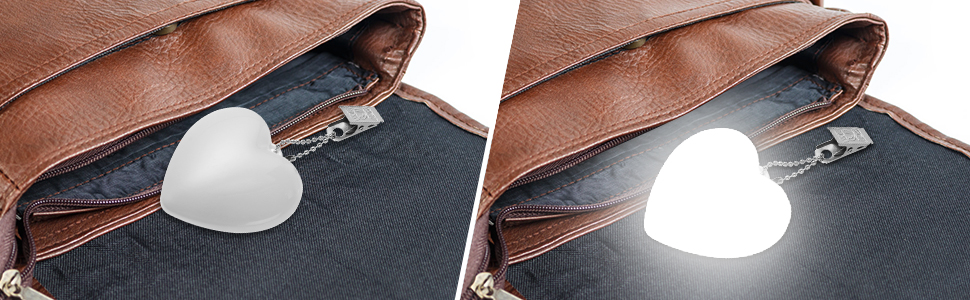 The heart shape purse lights have a hook, you can easily clip it to your handbag or purse, as a special decoration during the day.