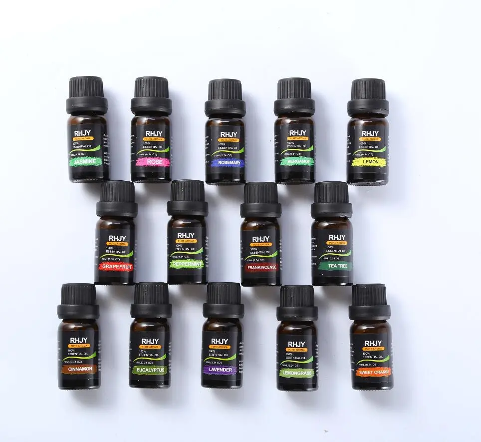 4 flavors in total:Rose, lemon, cinnamon, frankincense, jasmine, bergamot, grapefruit, rosemary, eucalyptus, tea tree, lemon grass, sweet orange, mint, lavender