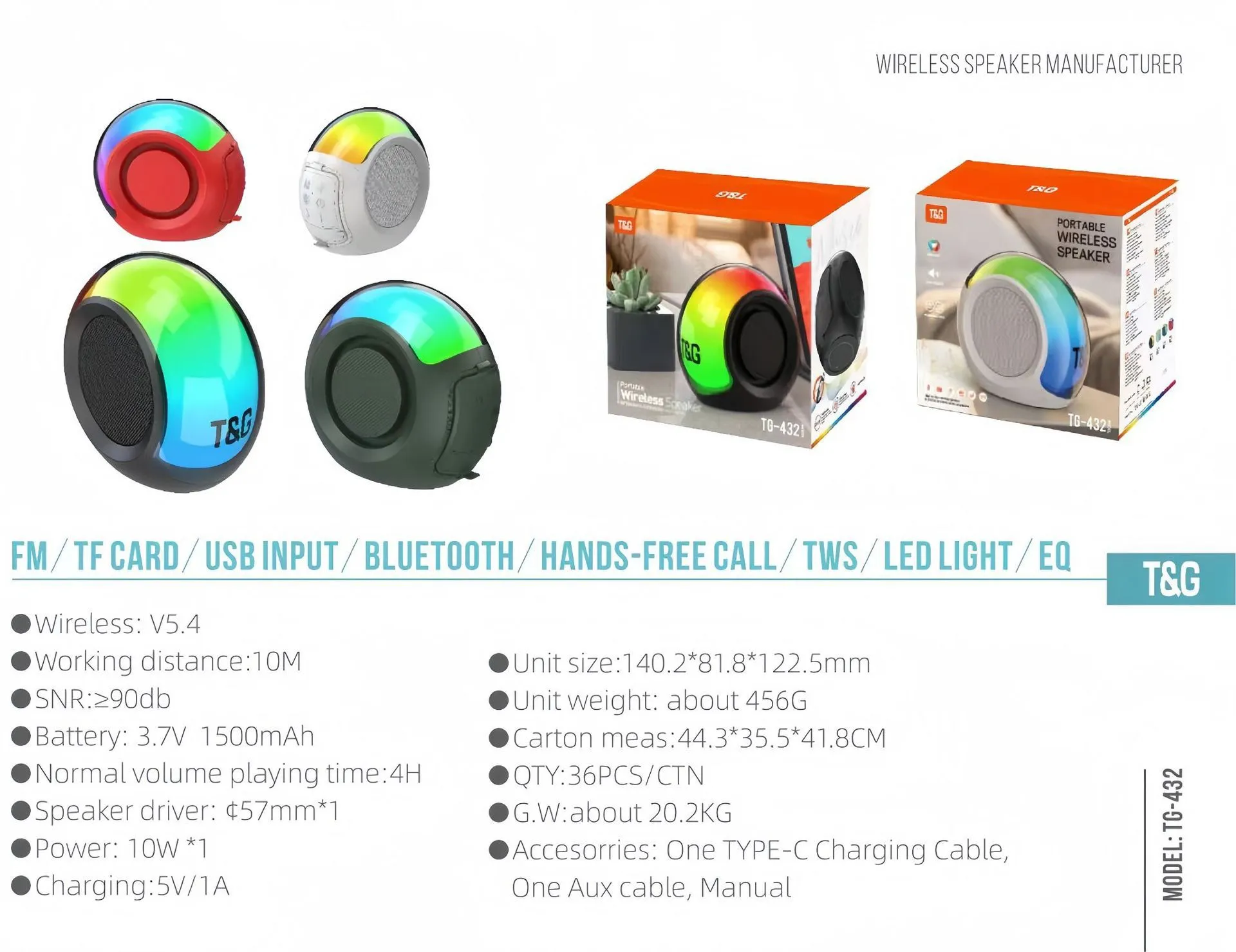 The Home Creative Colorful TG432 Bluetooth Speaker is a compact, powerful, and versatile audio device designed to bring a unique blend of style and functionality to your listening experience. With its vibrant LED lighting, excellent sound quality, and portability, this speaker is perfect for both indoor and outdoor use. Whether you're hosting a party, relaxing at home, or enjoying some time outdoors, the TG432 Bluetooth speaker provides an immersive audio experience with the convenience of wireless connectivity.