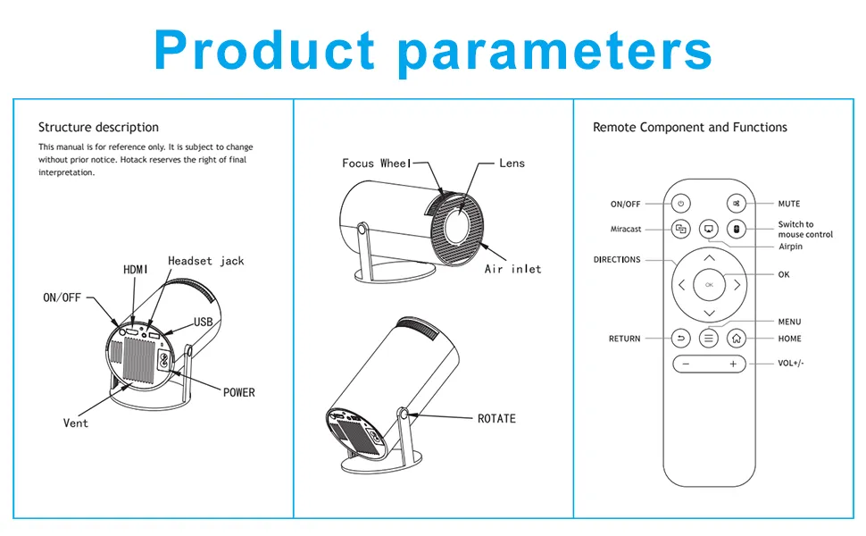 - Automatic correction: Support automatic vertical correction function to ensure that the projection picture is always clear and correct.
