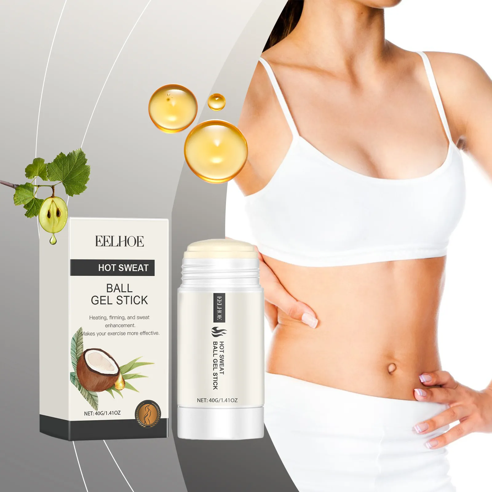 hot sweat ball gel stick, workout gel stick, sweat enhancing gel, firming gel for exercise, coconut extract gel, fitness sweat gel, firming and sweat gel, exercise gel for body sculpting, body firming gel for workouts