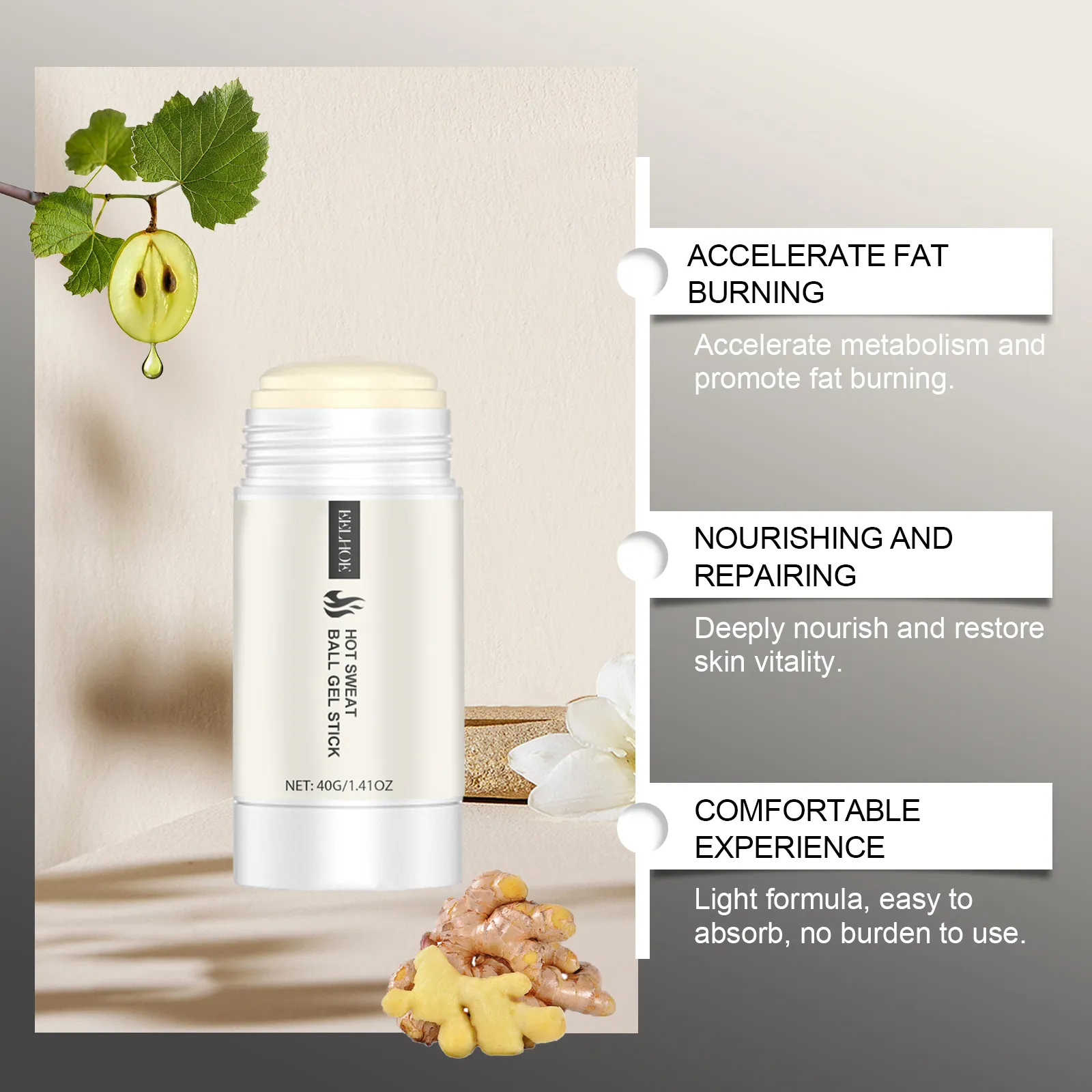 The Hot Sweat Ball Gel Stick enhances your workout with heating, firming, and sweat-boosting properties. Perfect for increasing sweat, firming the skin, and supporting fitness goals.
