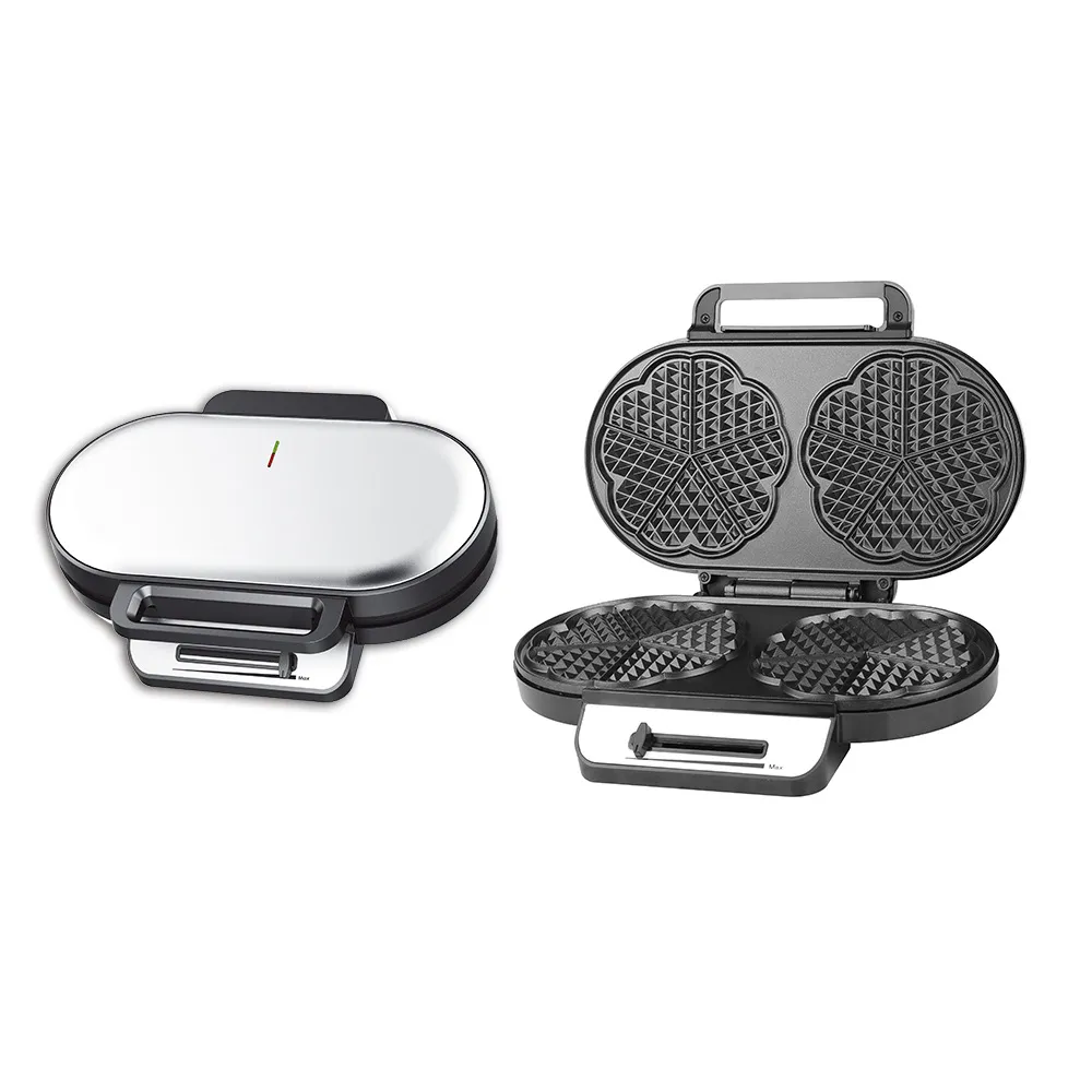 - Cooks two batches of heart-shaped waffles at once, saving time.