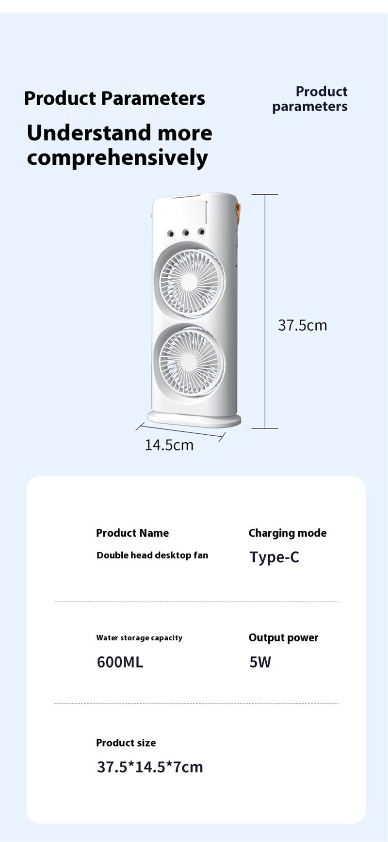 Stay cool and comfortable with our Double-ended Spray Fan, a versatile portable humidifier fan that combines the benefits of an air conditioner into one compact device. Perfect for personal use at home, in the office, or on the go, this small air cooler offers efficient cooling and air adjustment. Ideal for households in New Zealand, it ensures you stay refreshed during hot days.Overview: