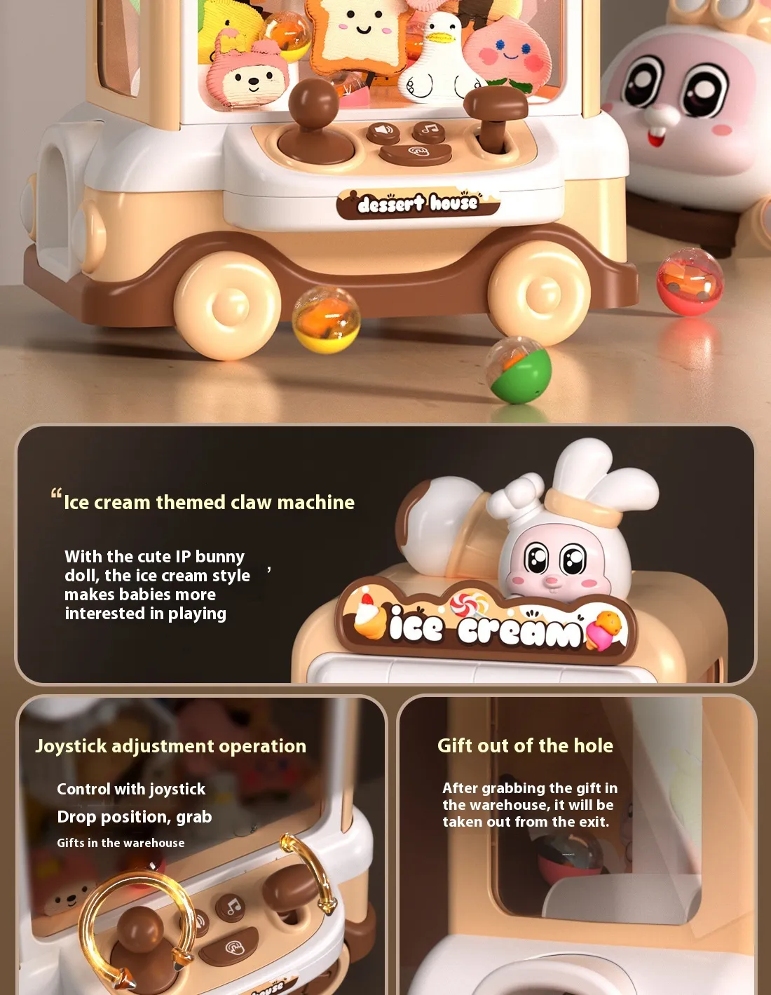 joystick to control the claw and try to grab their favorite mini dolls or prizes from the toy-filled compartment. The thrill of the