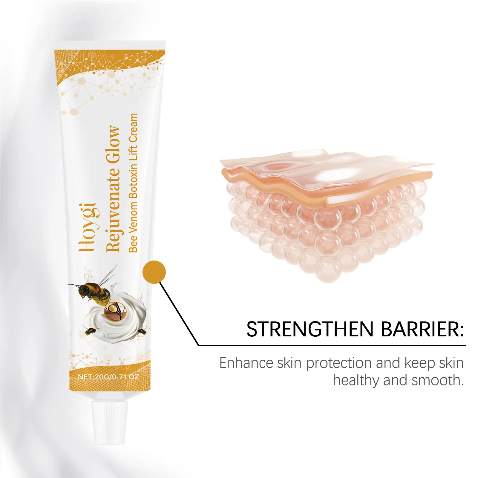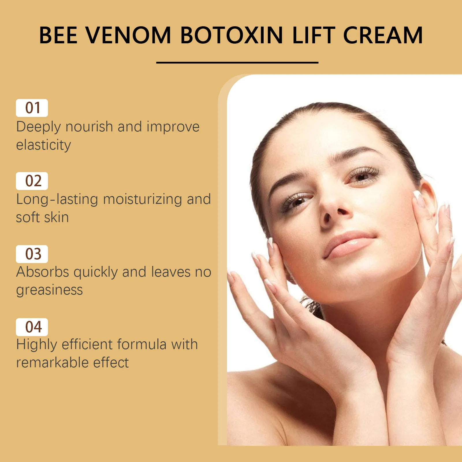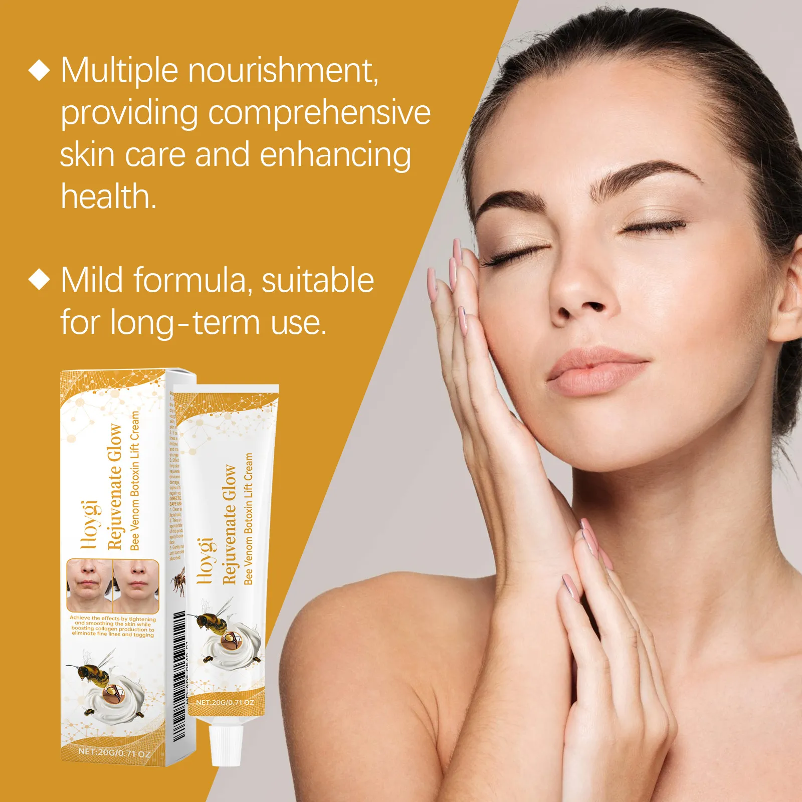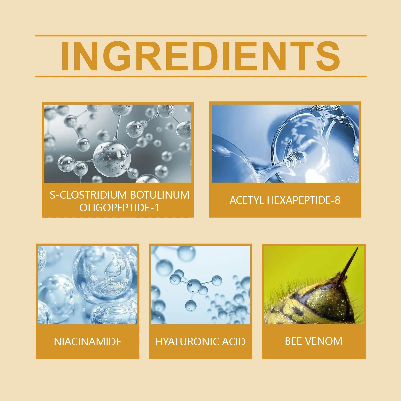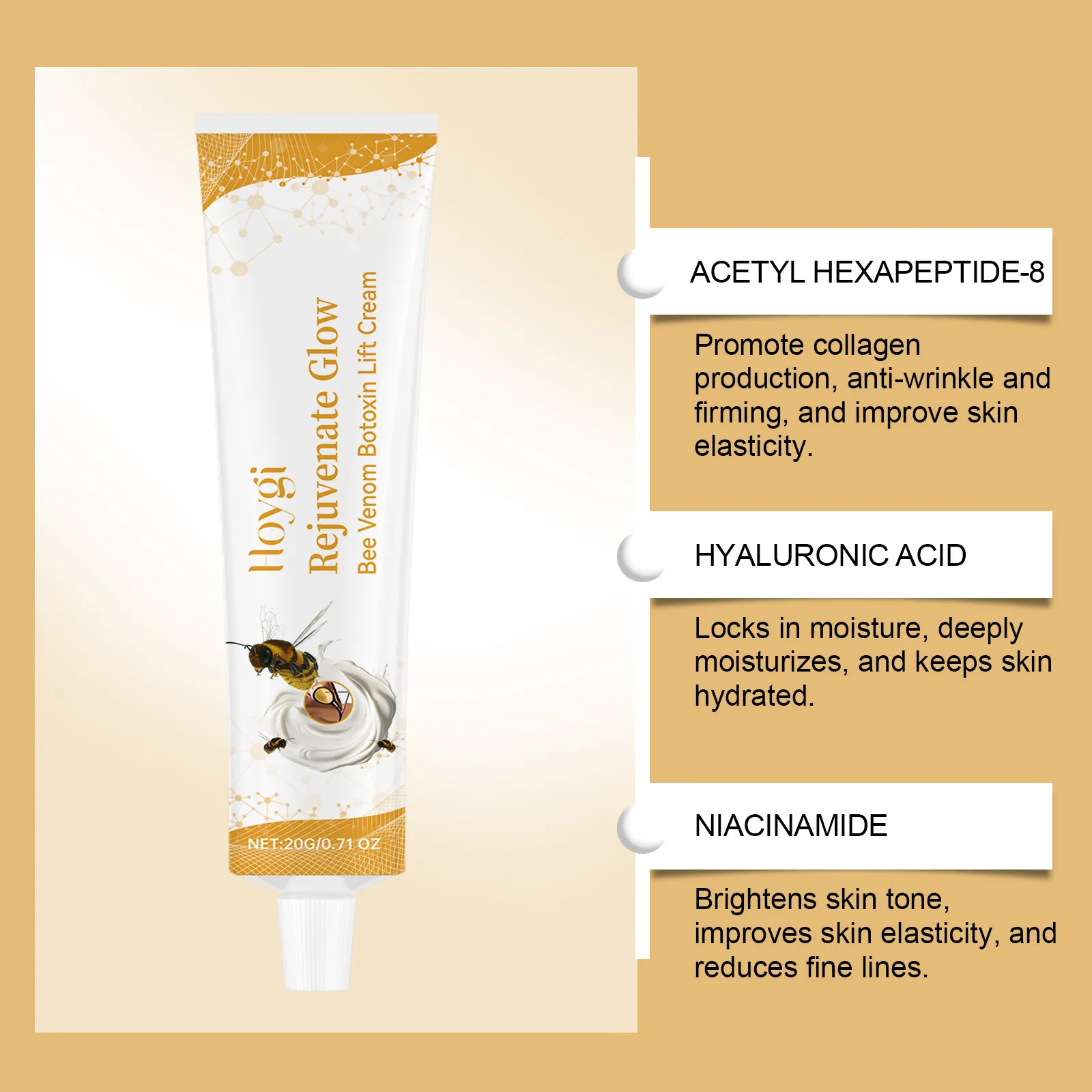 Ingredients: bee venom, nicotinamide, hyaluronic acid, acetyl hexapeptide-8, S-Botox Oligopeptide-1