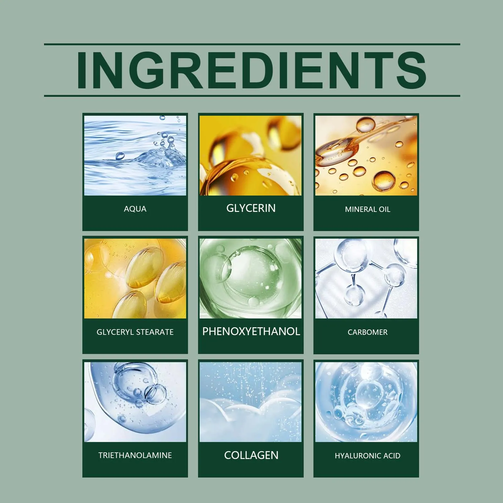 Ingredients: Water, glycerin, mineral oil, Glyceryl stearate, carbomer phenoxyethanol, triethanolamine, collagen, hyaluronic acid